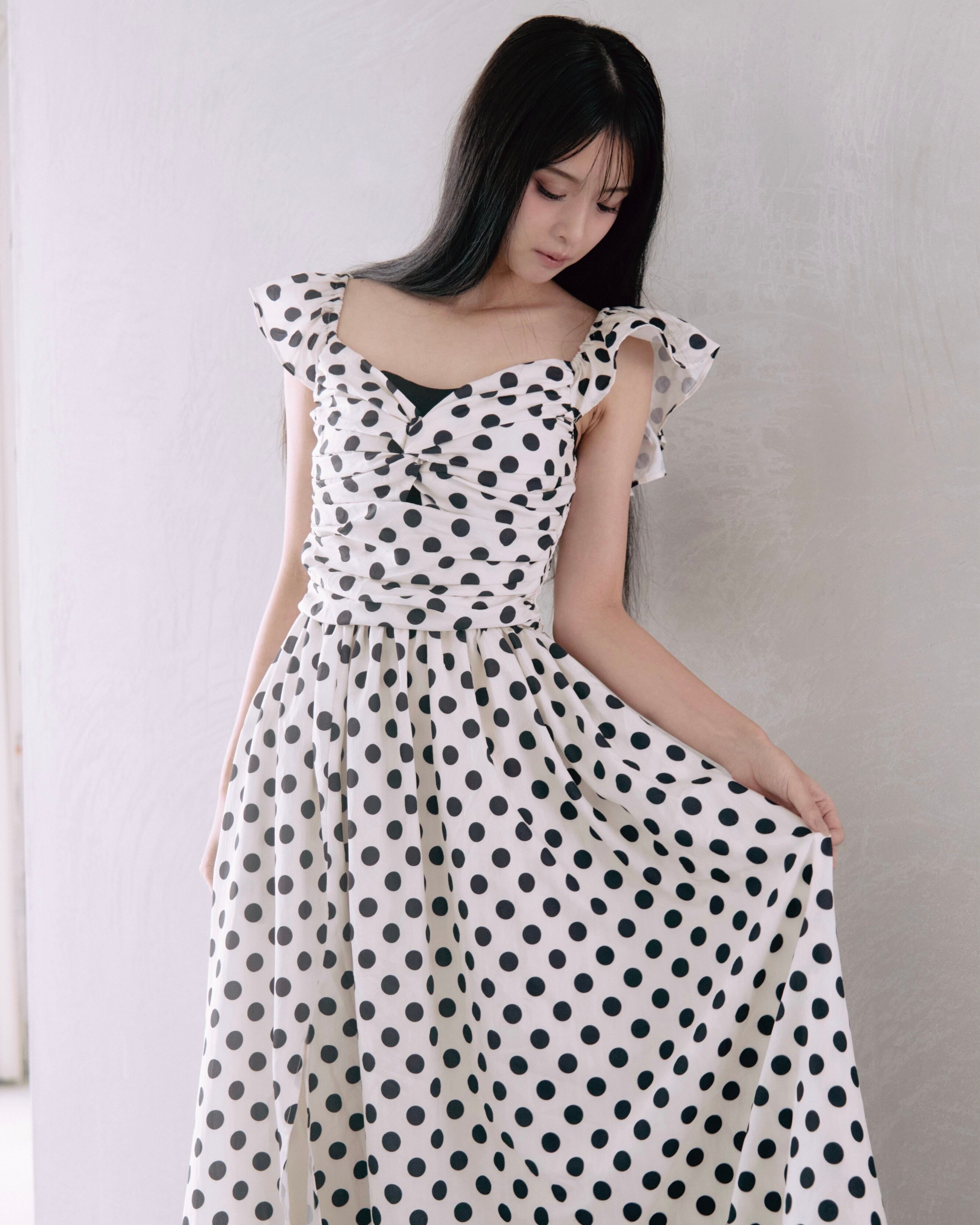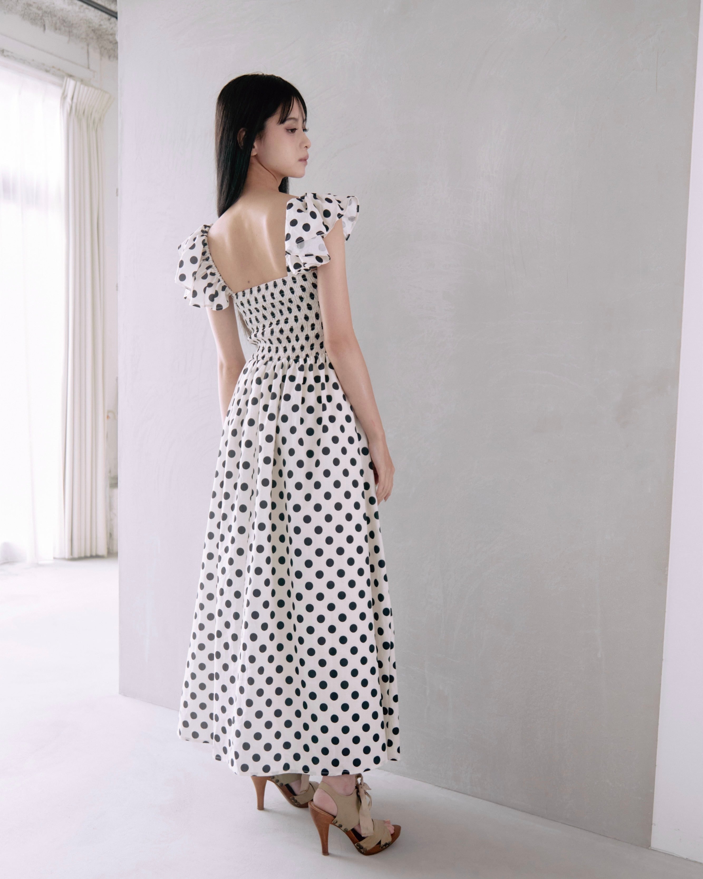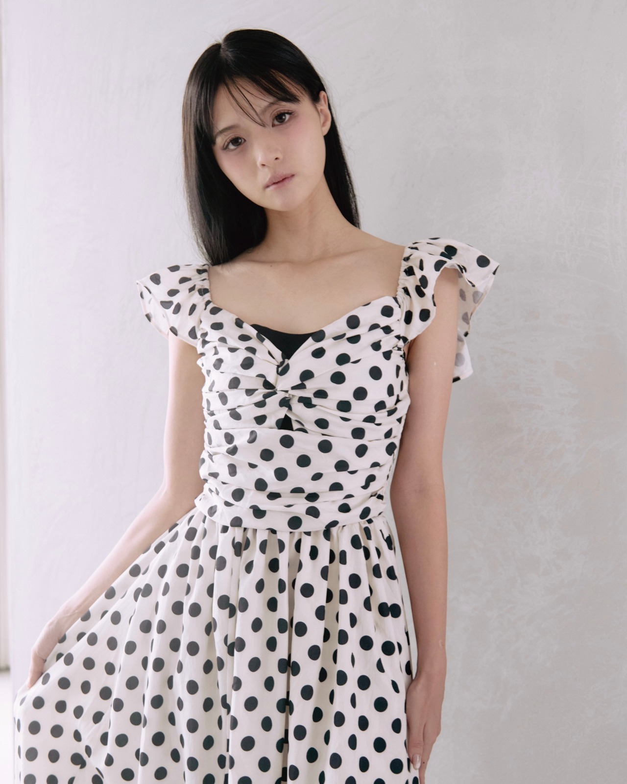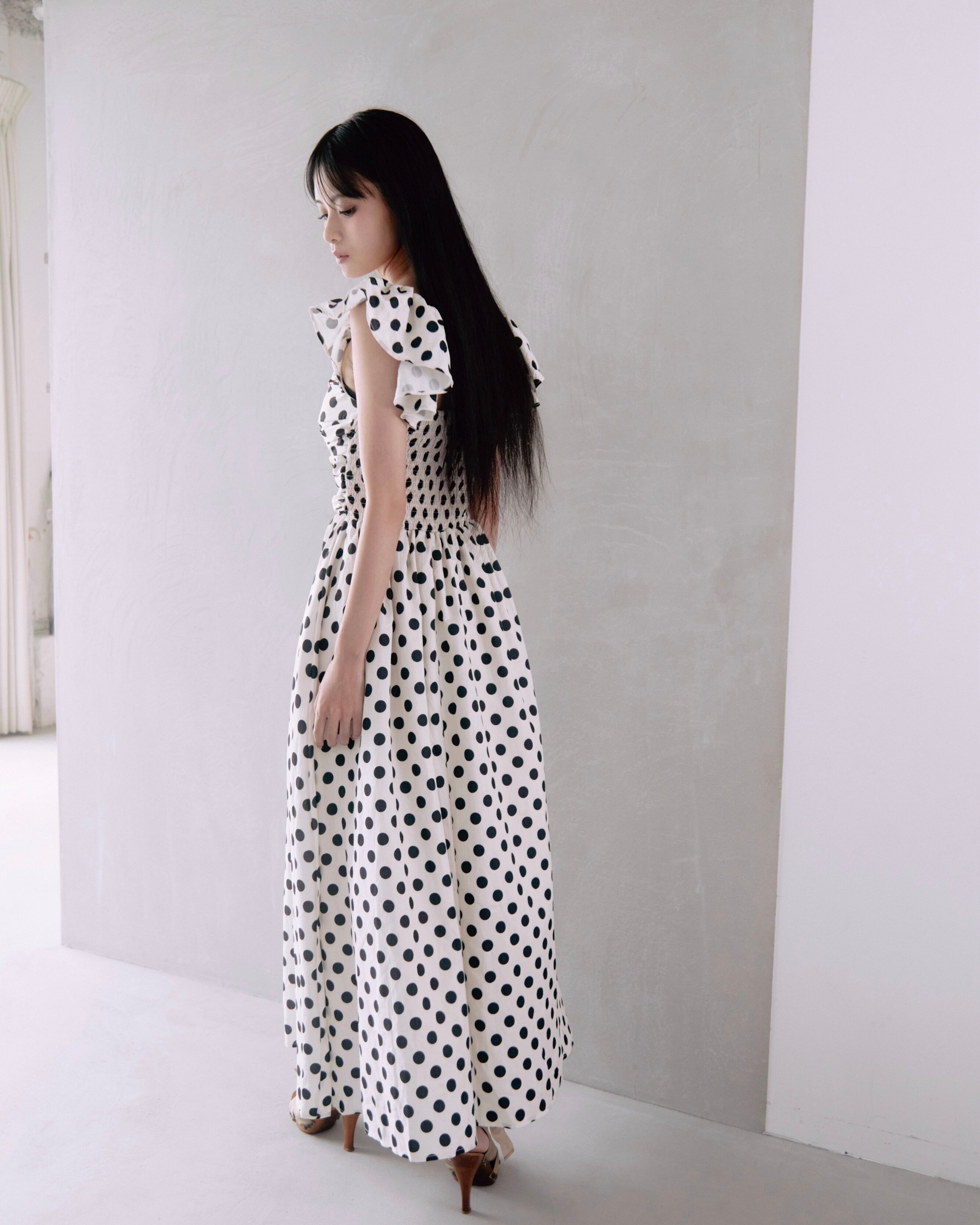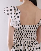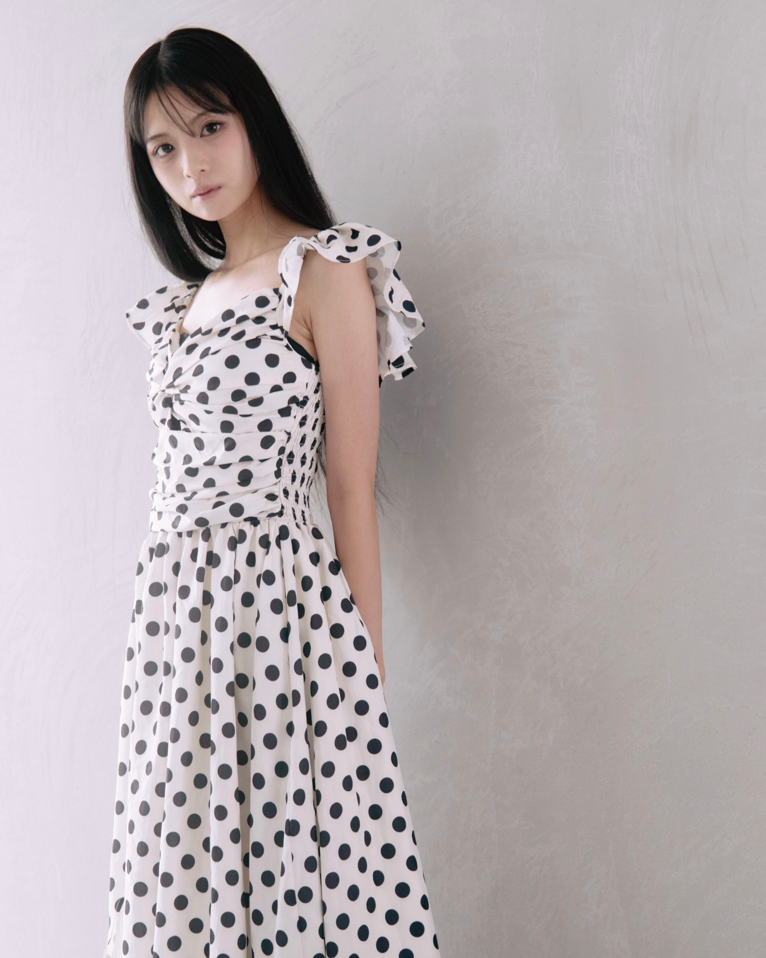 ウエストラインやフリル袖など甘すぎないディテールをプラス。