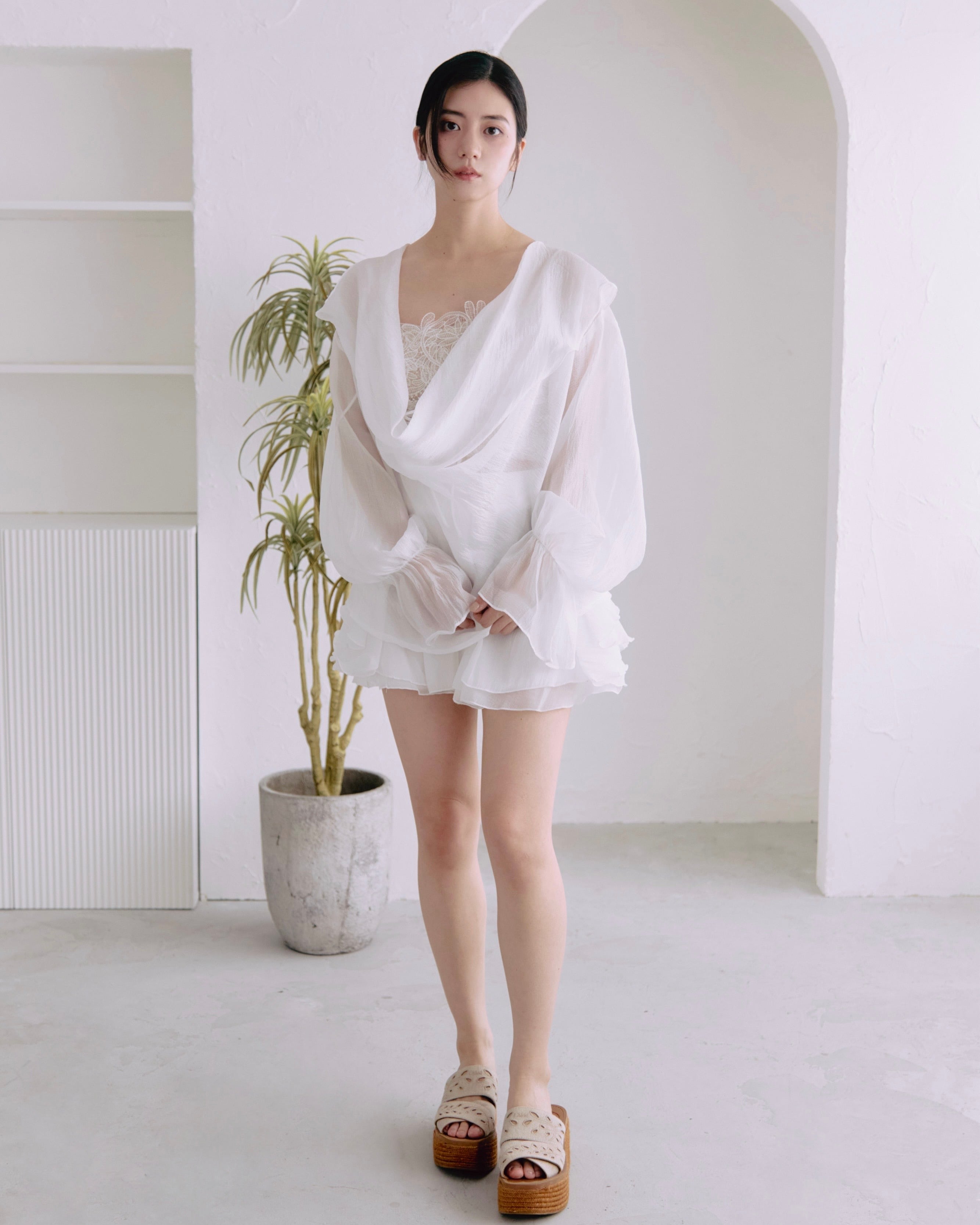 ドレープシャツはノースリーブやキャミワンピースの