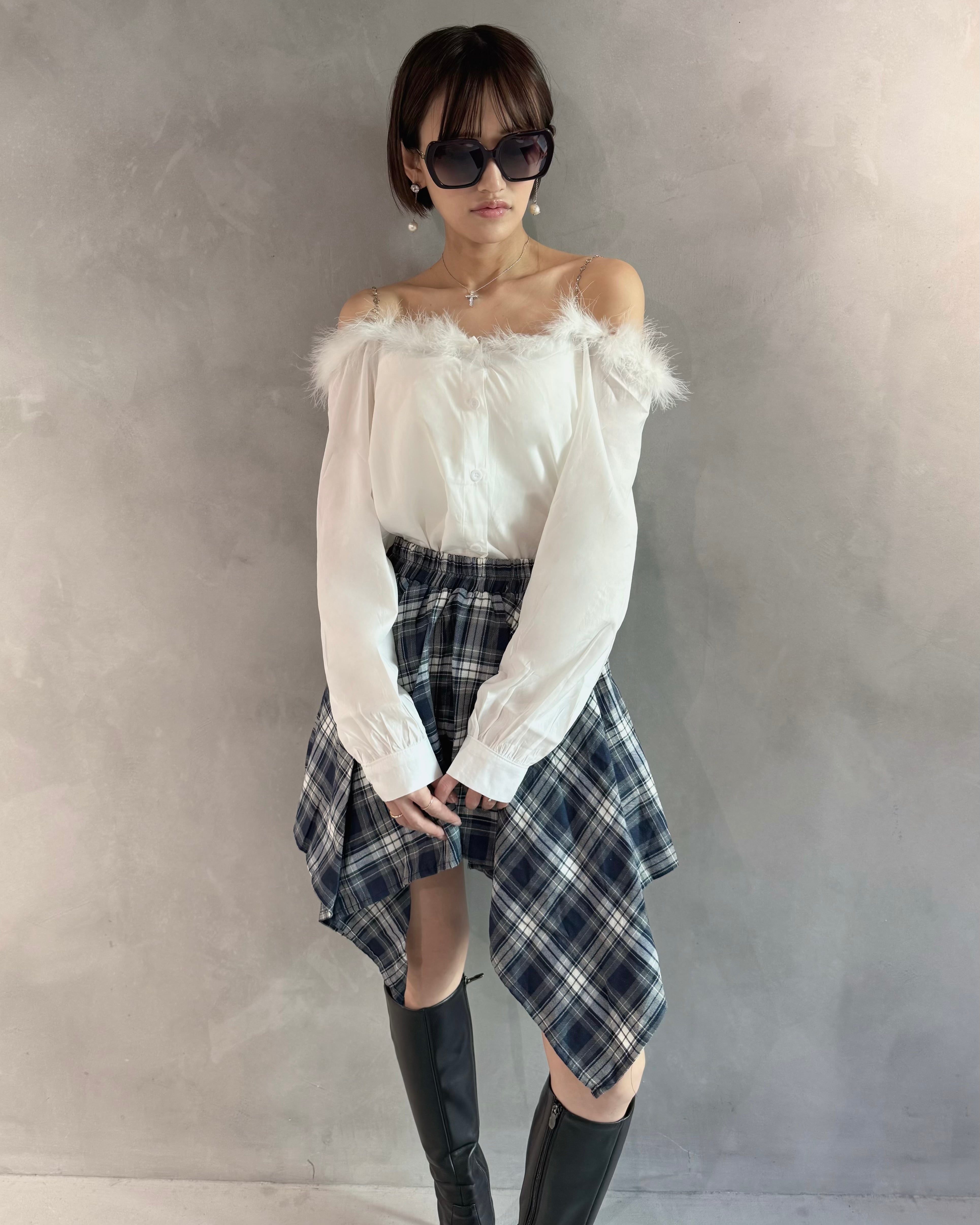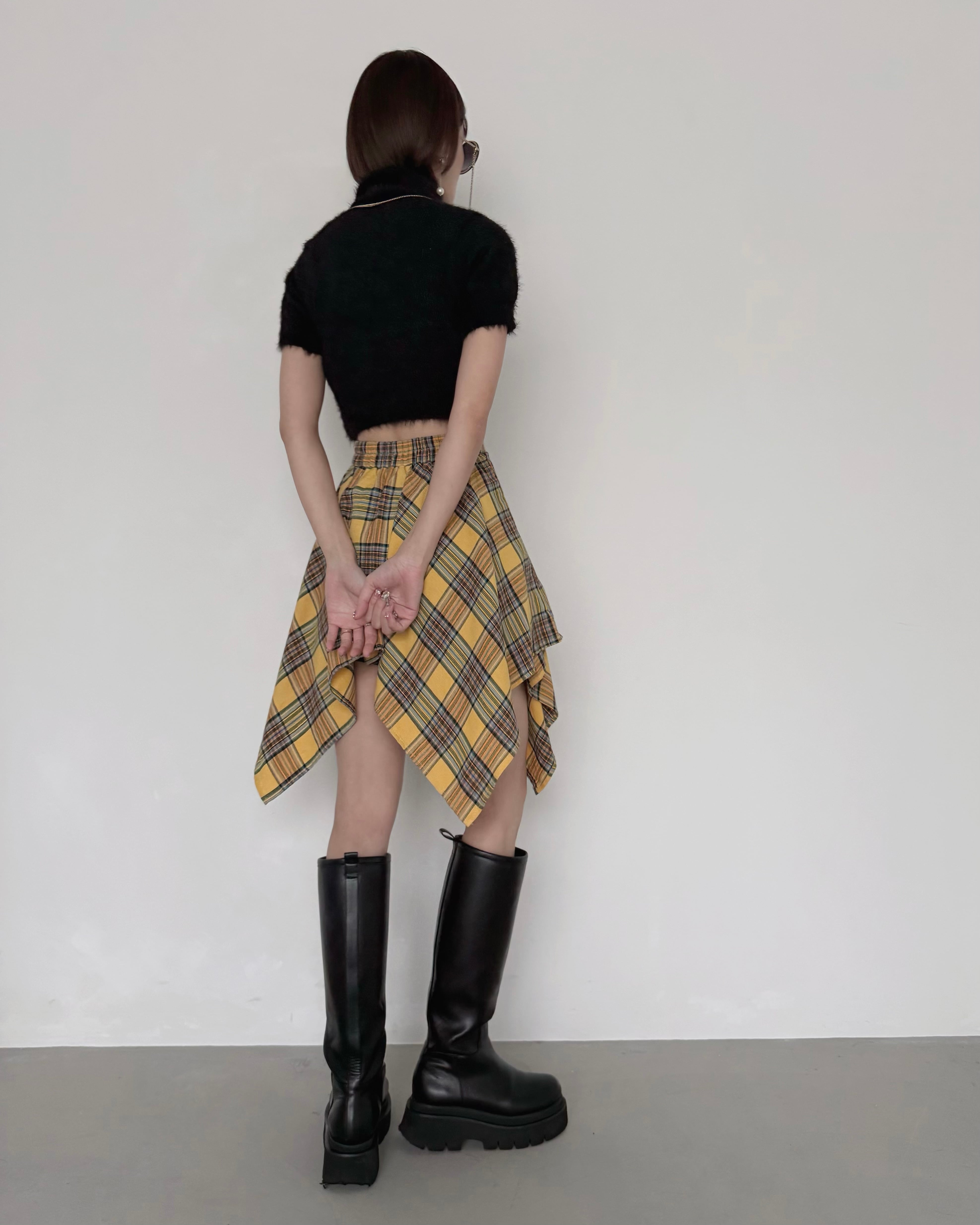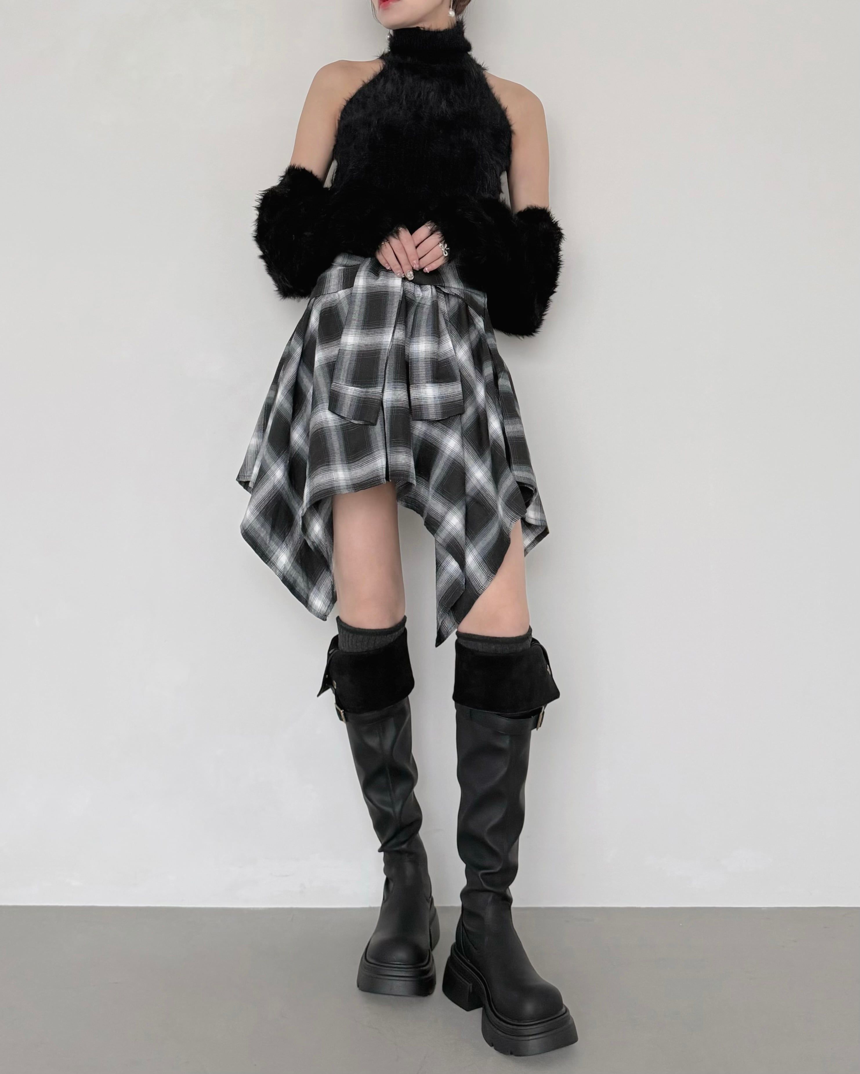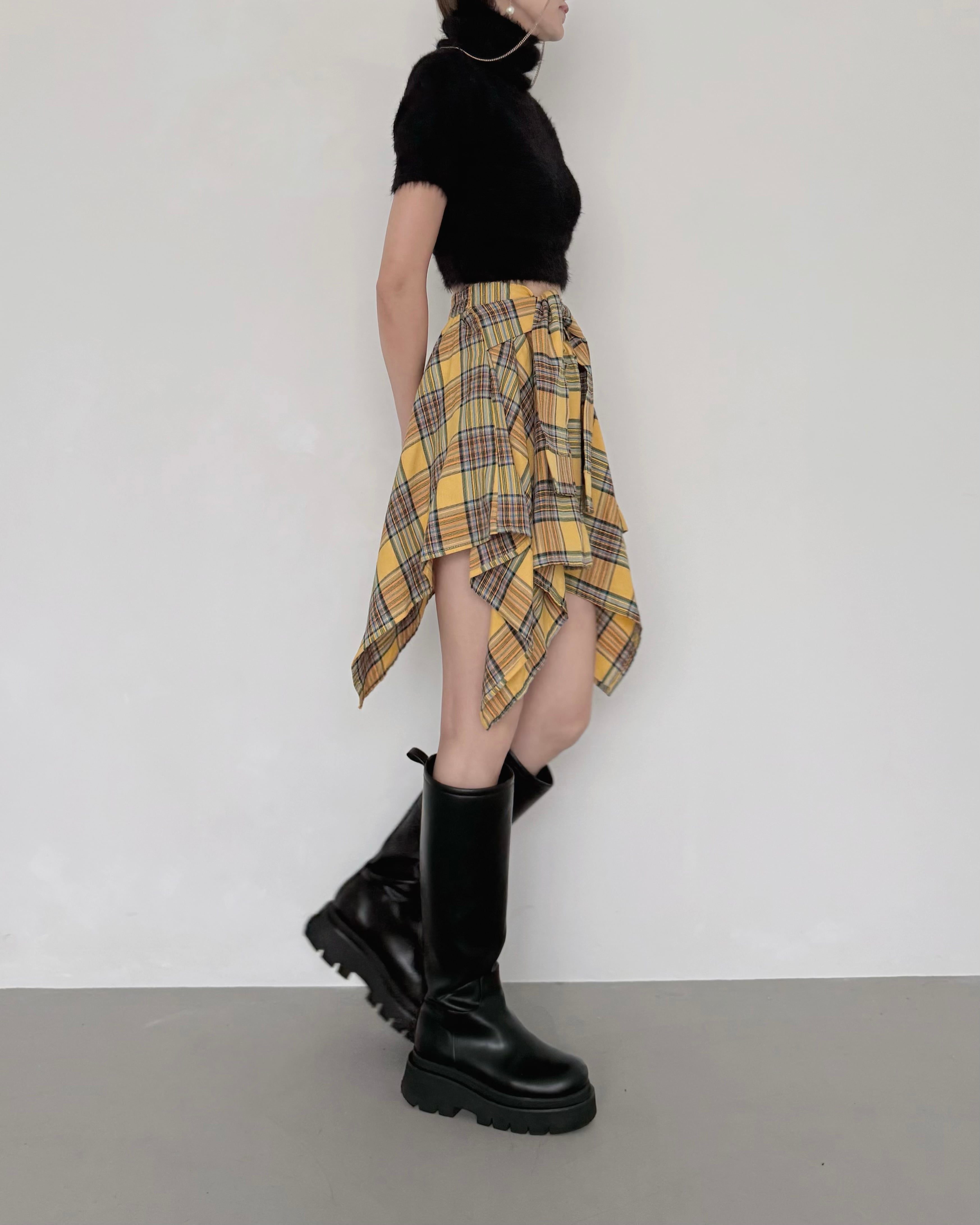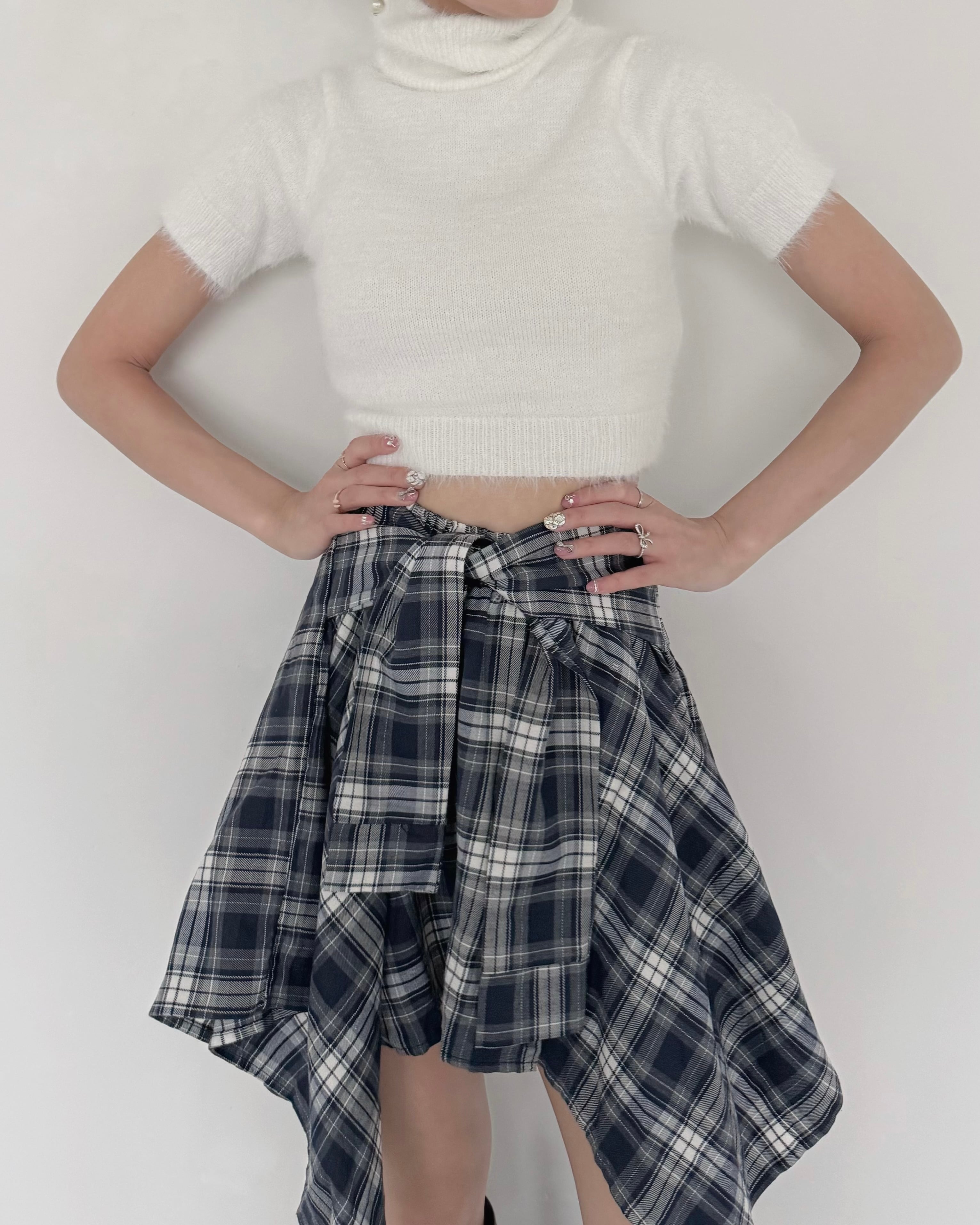 スタイリッシュなチェックラップスカート。