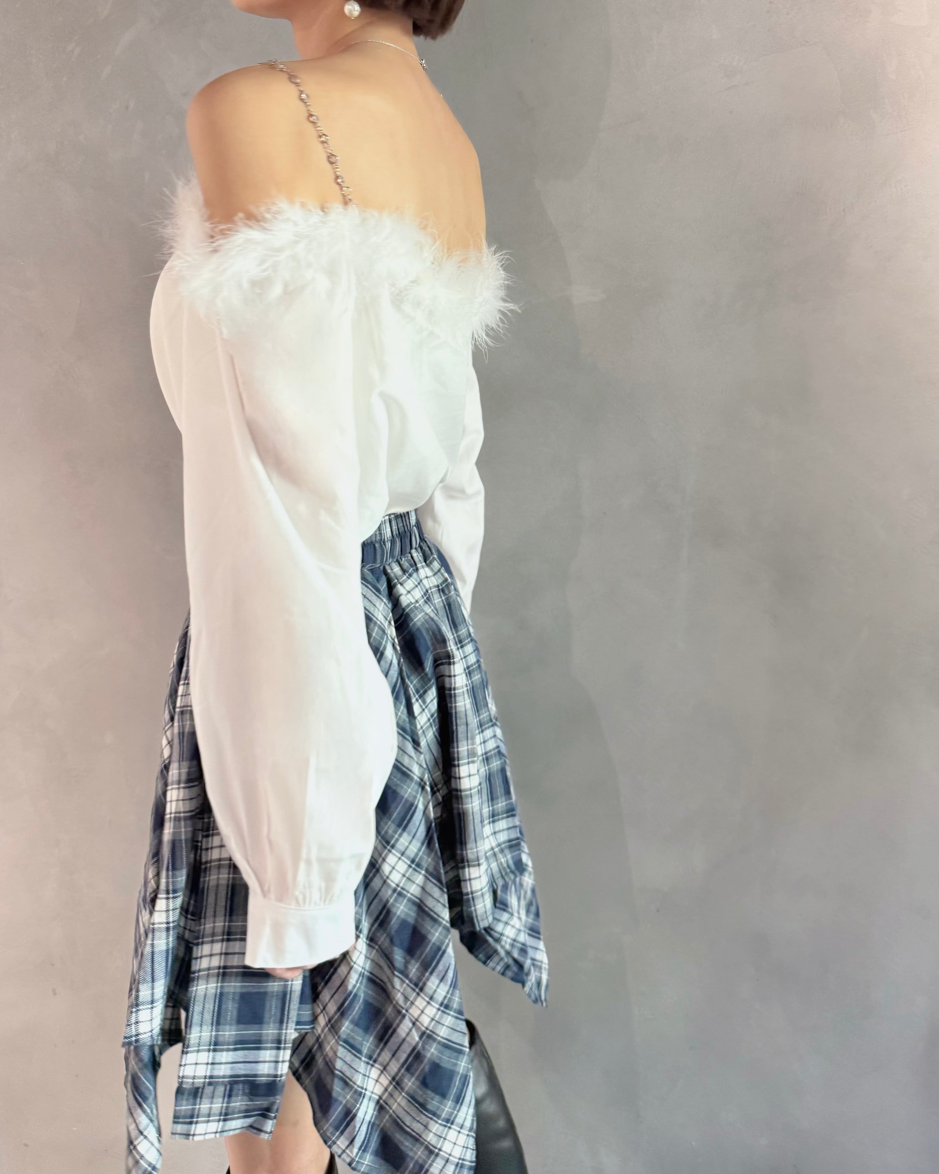 腰巻き風のディテールとアシンメトリーなヘムラインが、