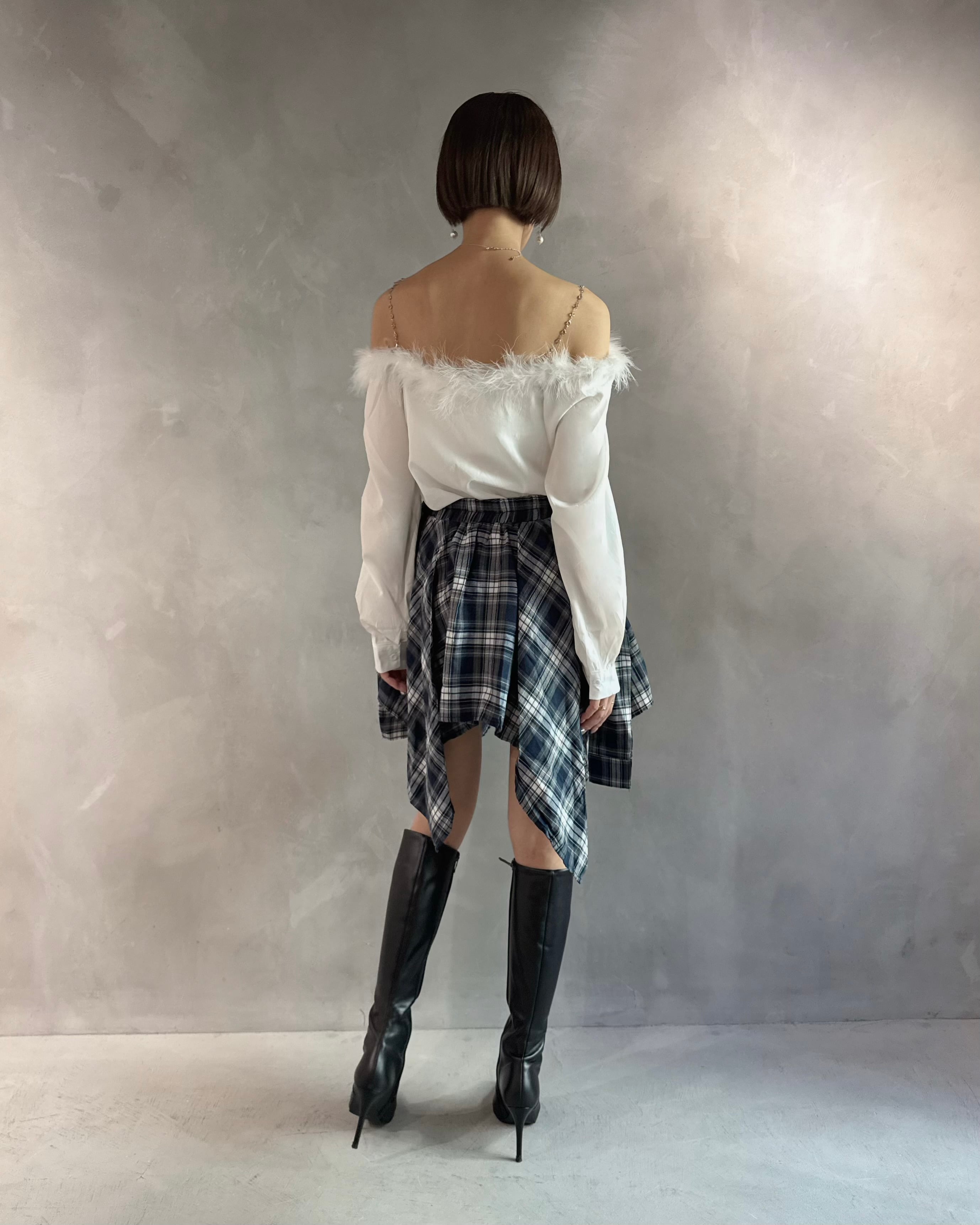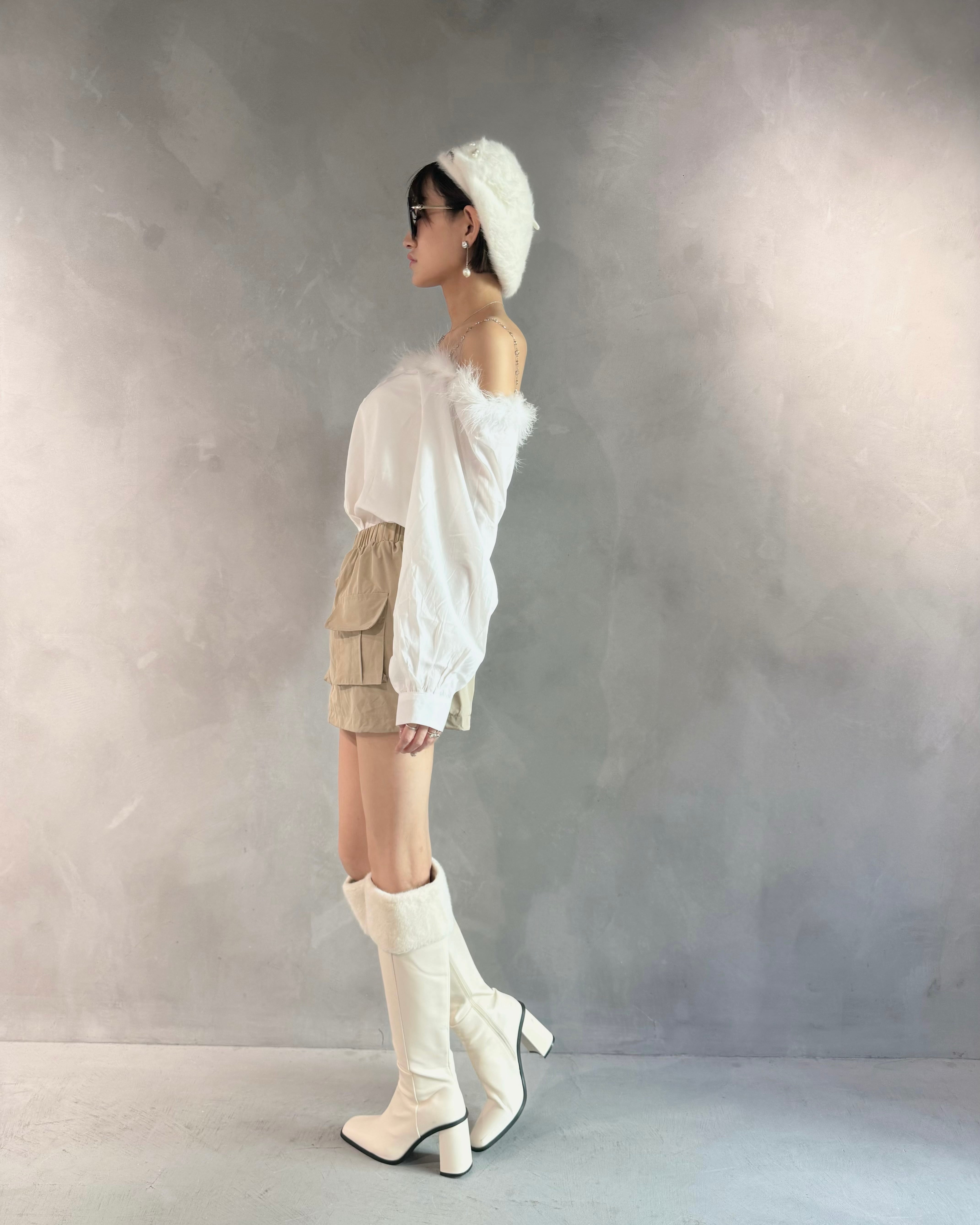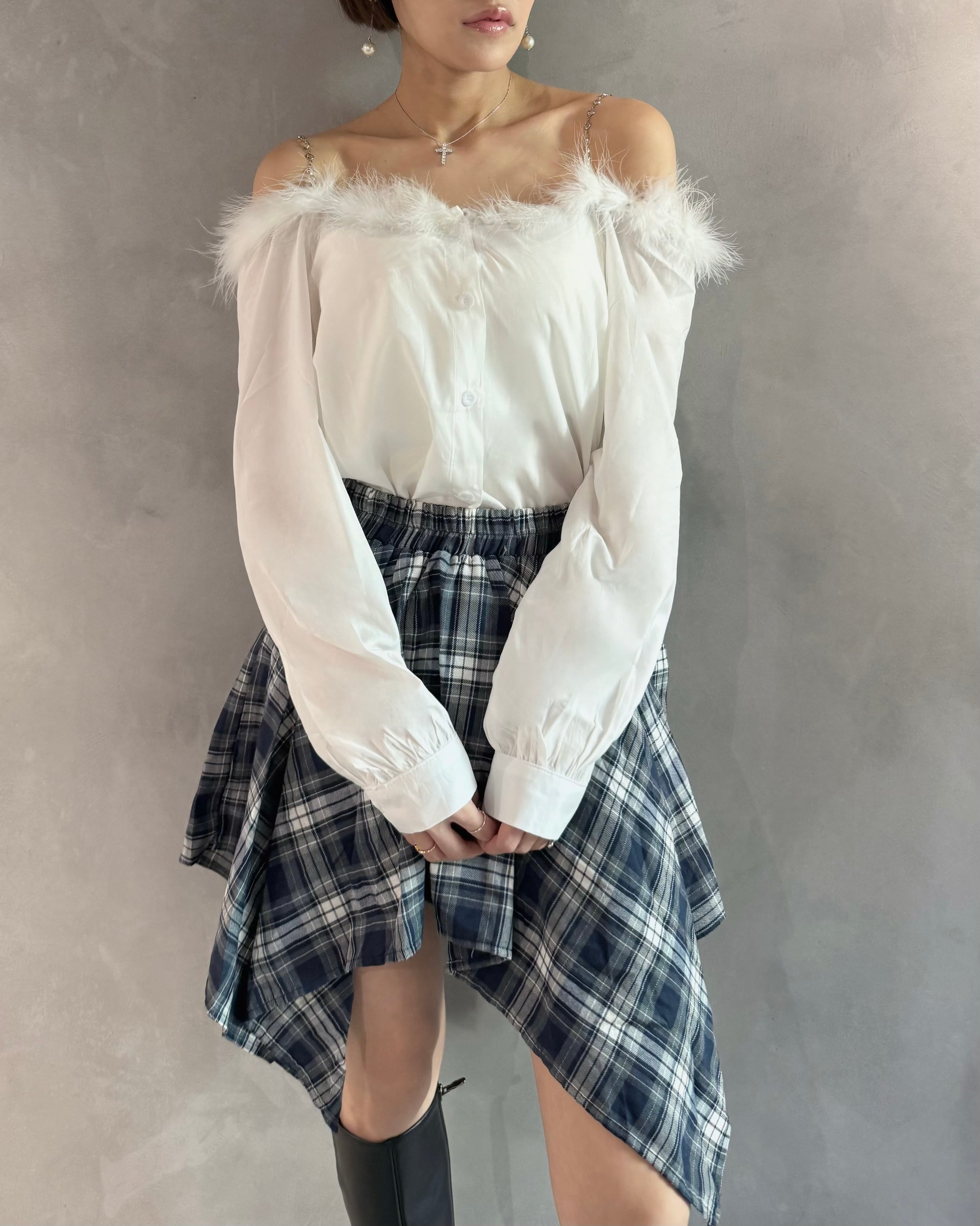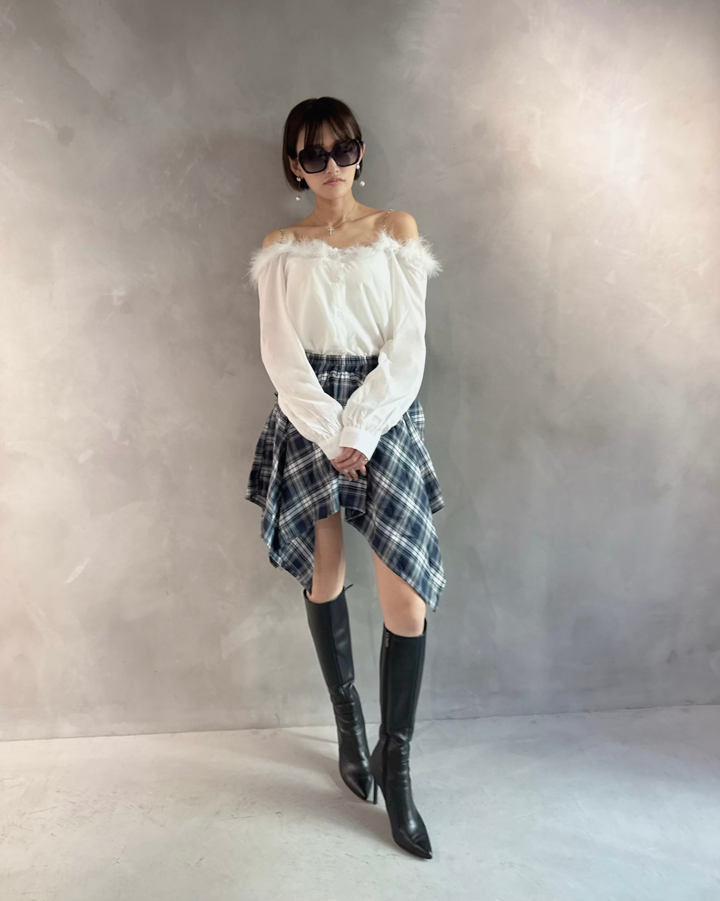煌めくビジュー付きストラップをプラスしたオフショルダーブラウス。