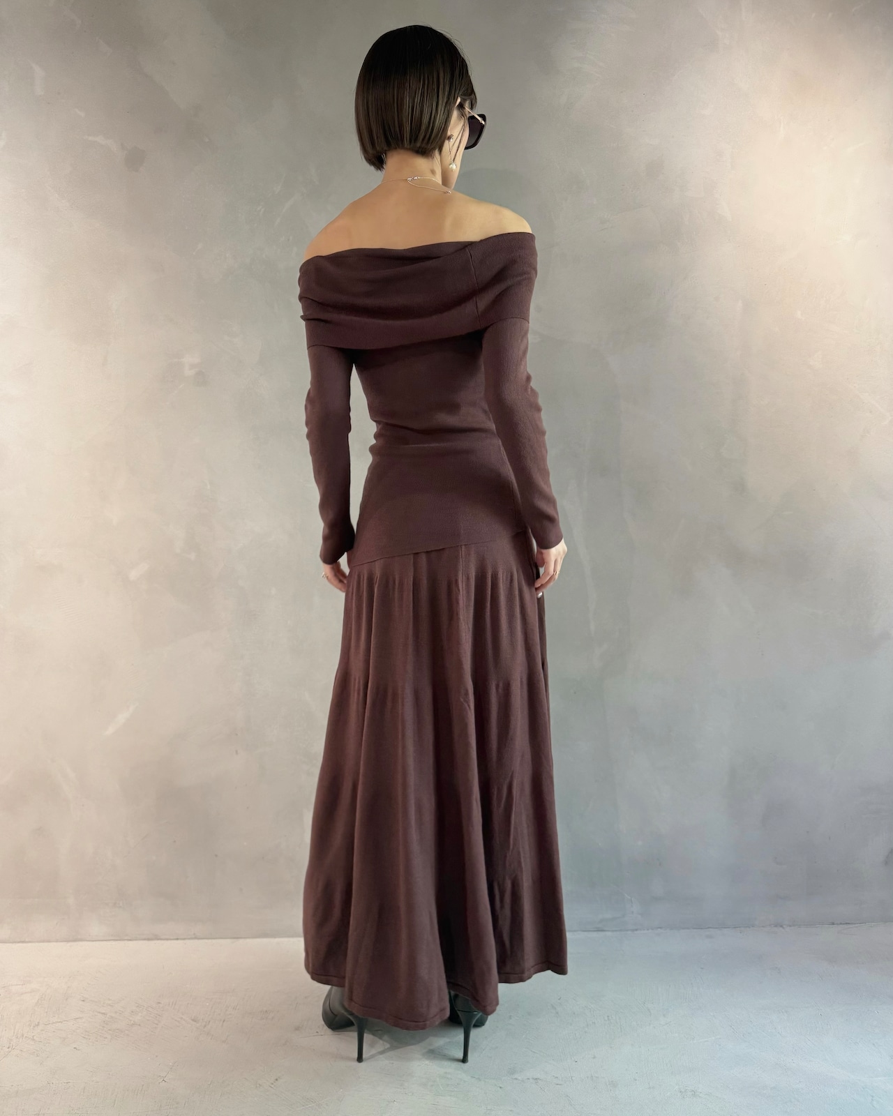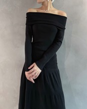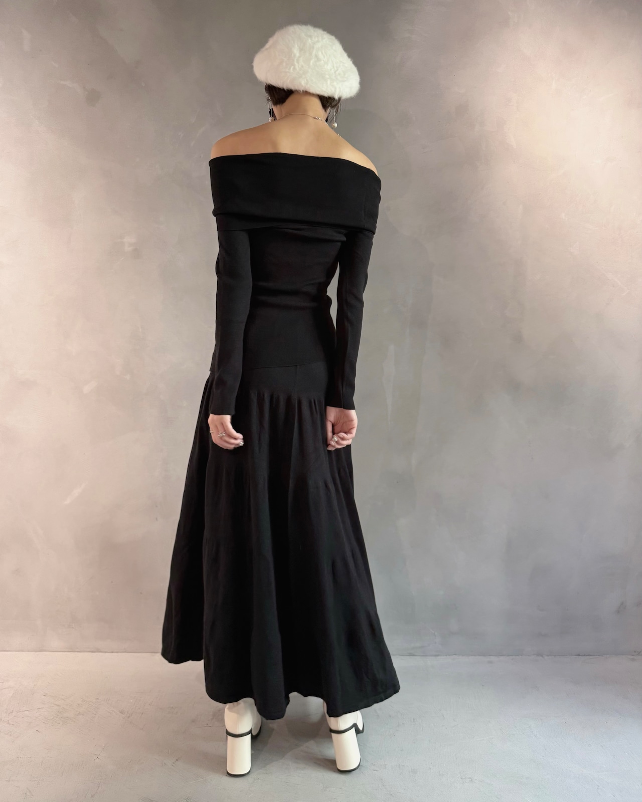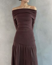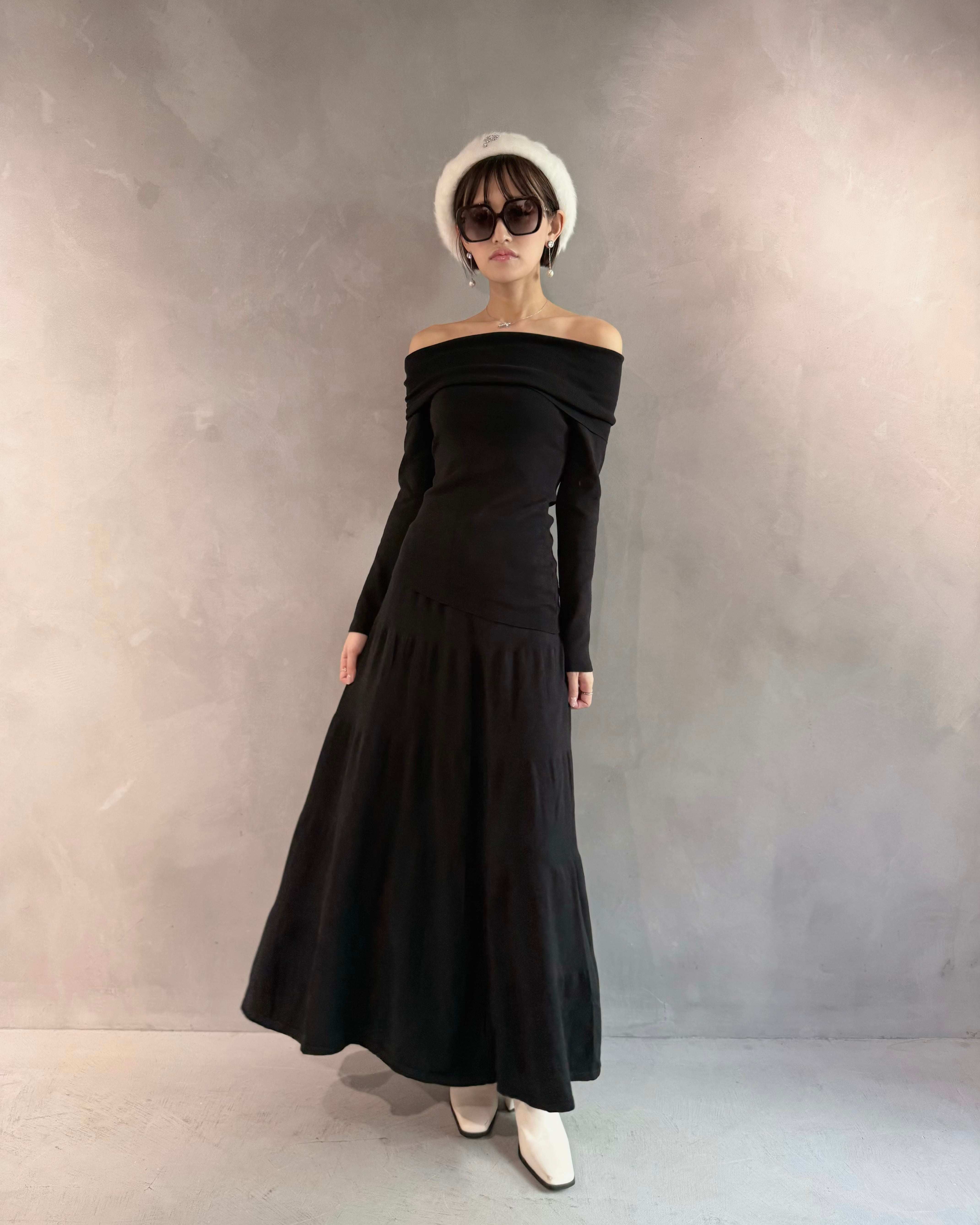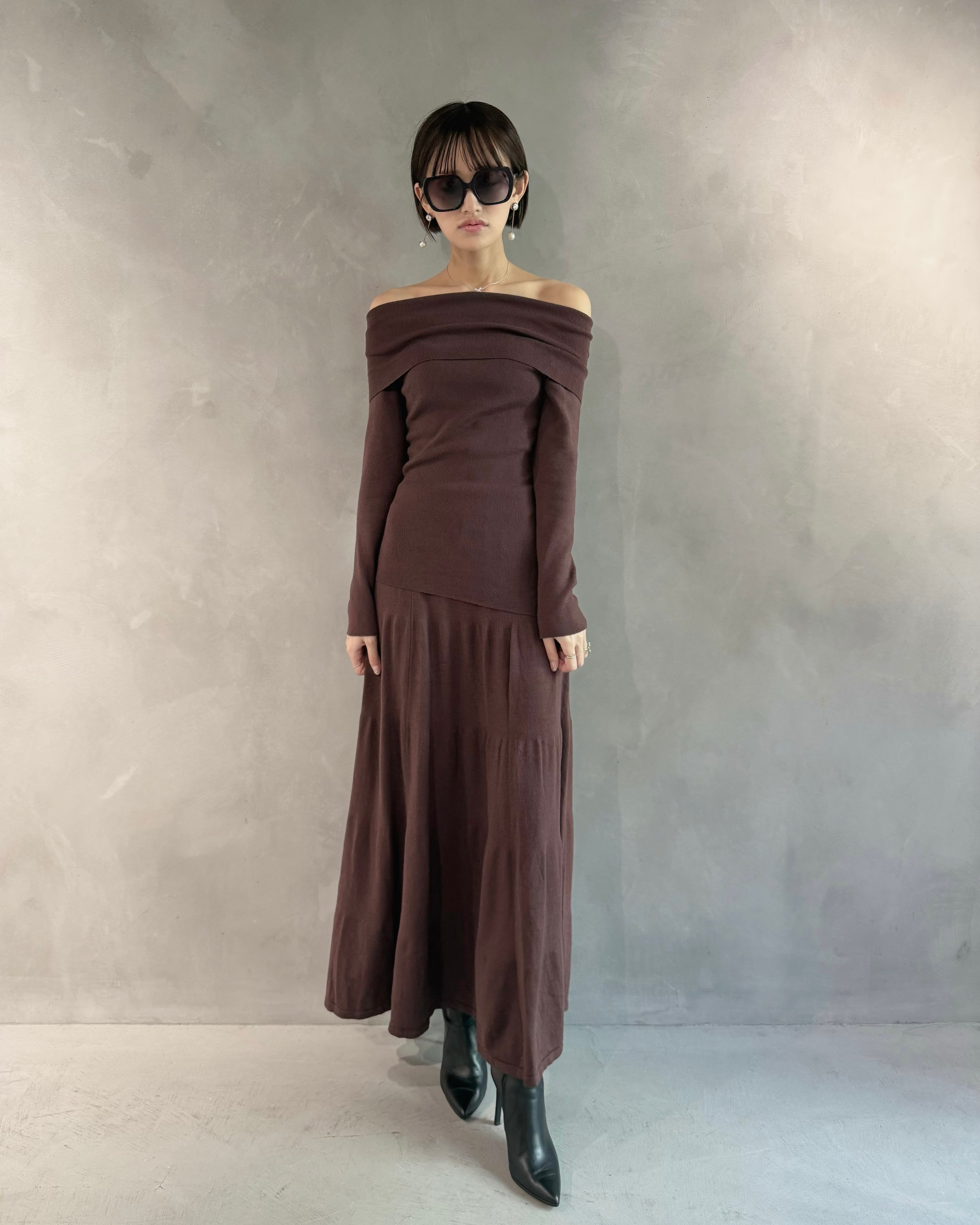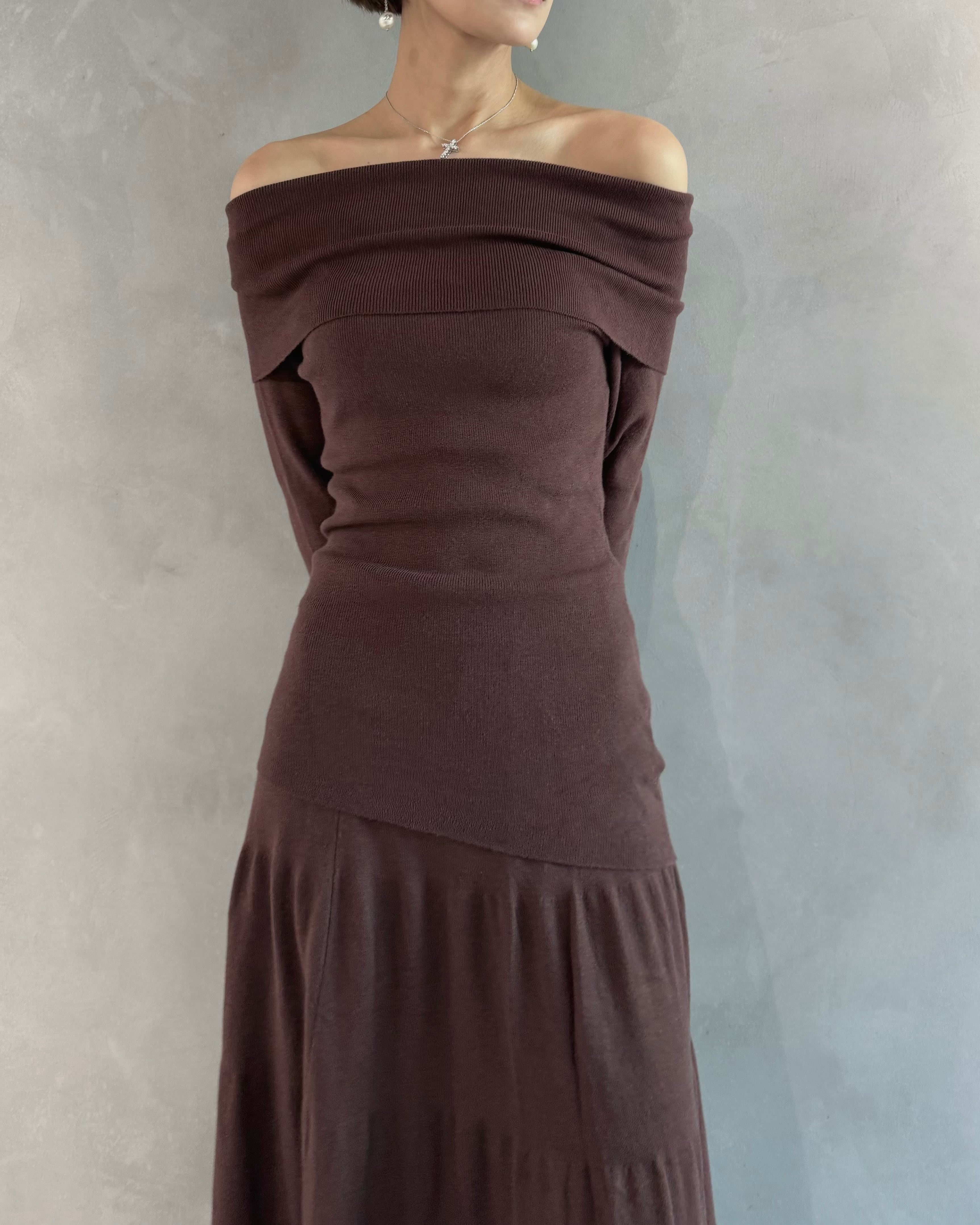 上品な抜け感を叶えるオフショルダーニットセットアップ。