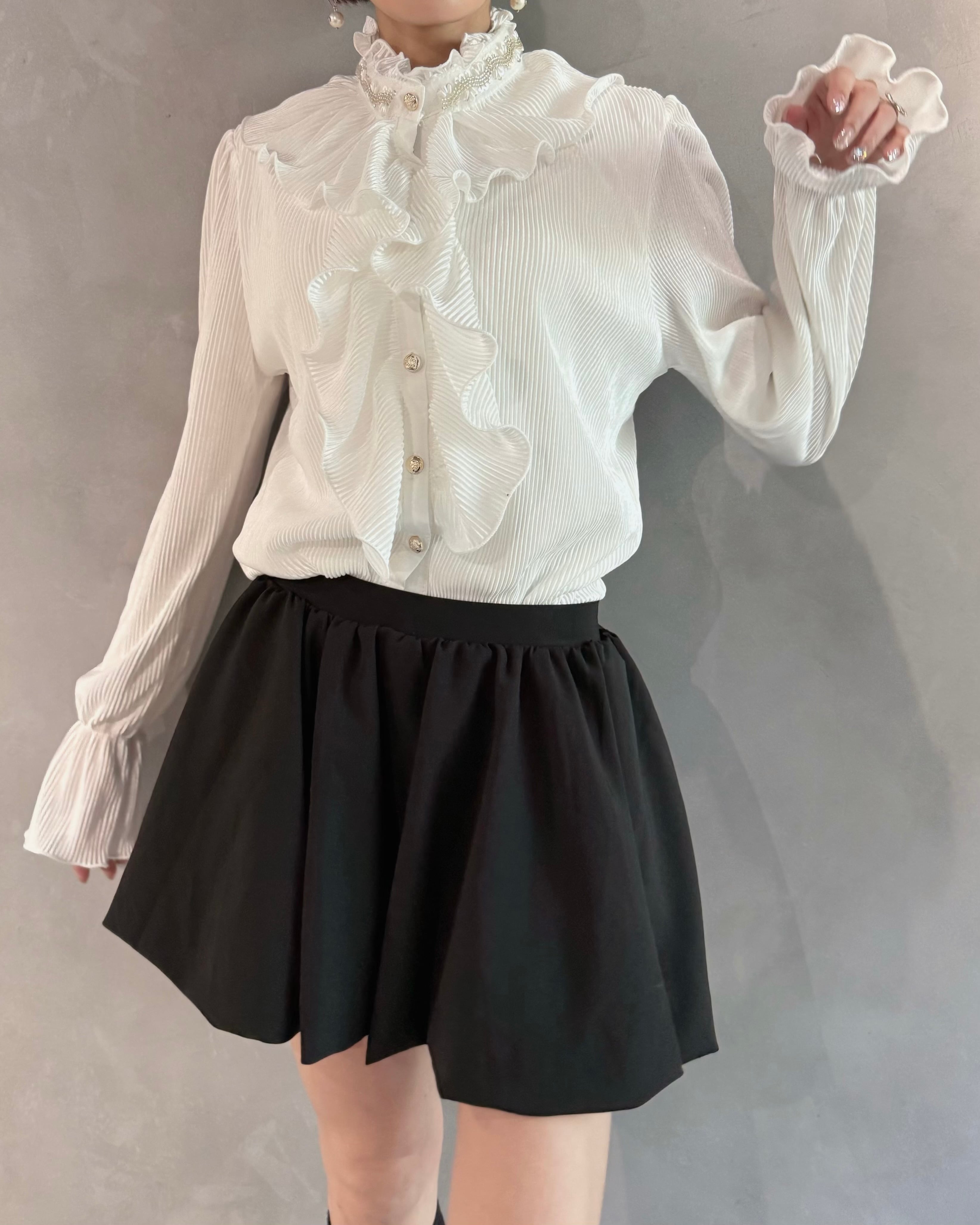 繊細なプリーツ地と華やかなフリルを贅沢にあしらった、