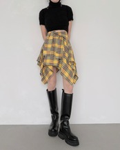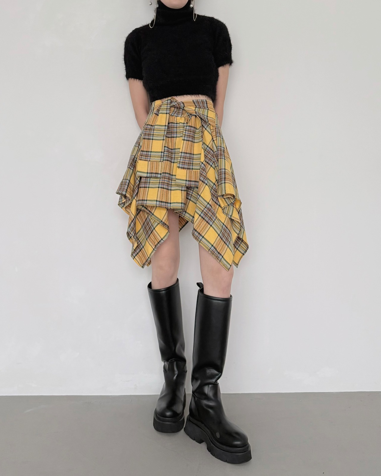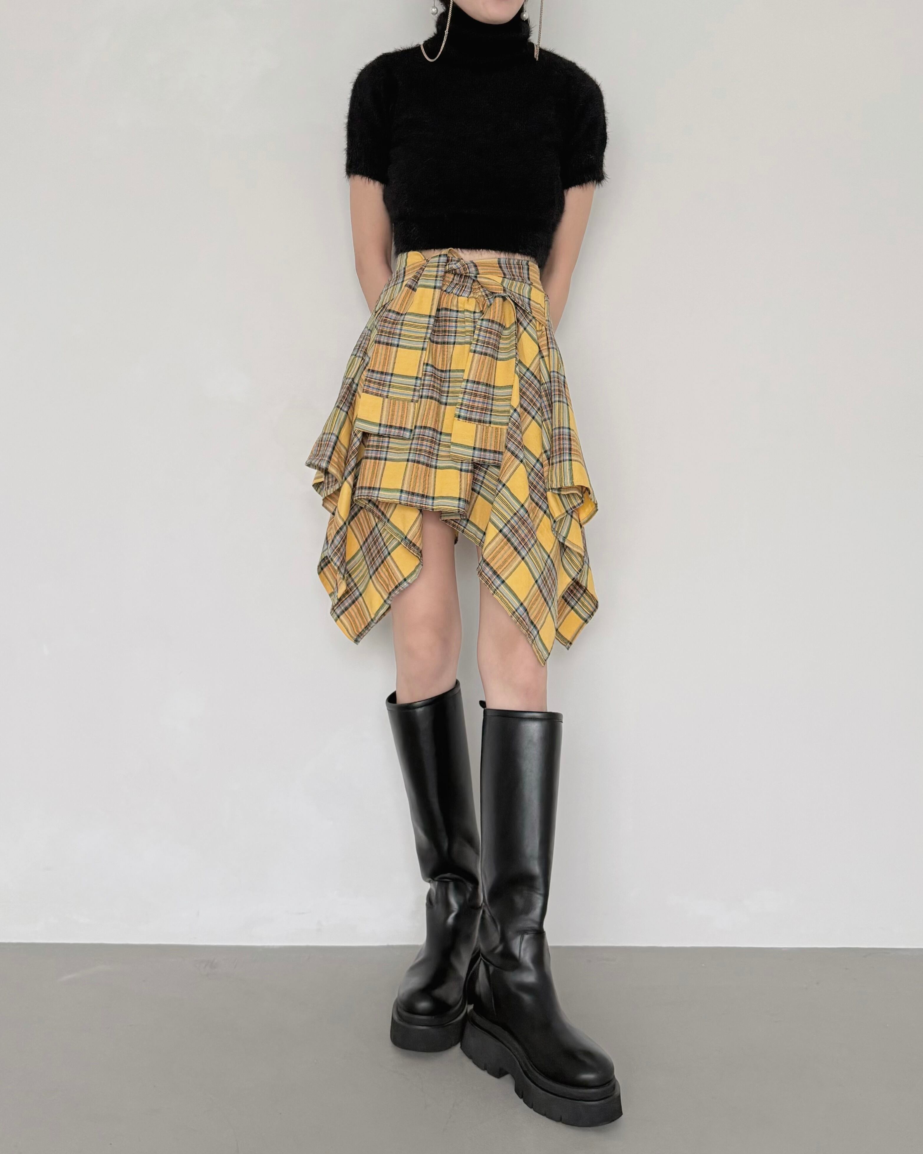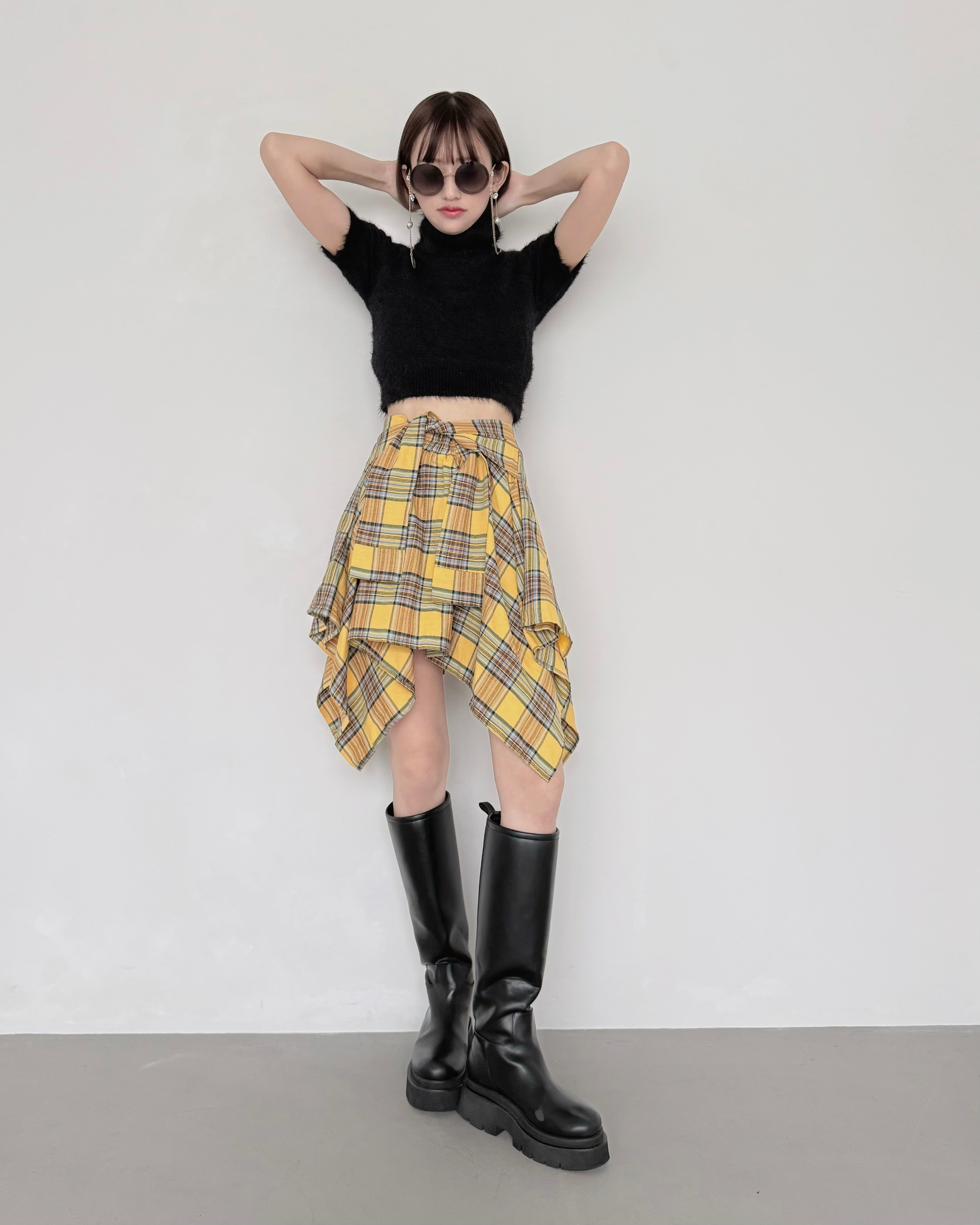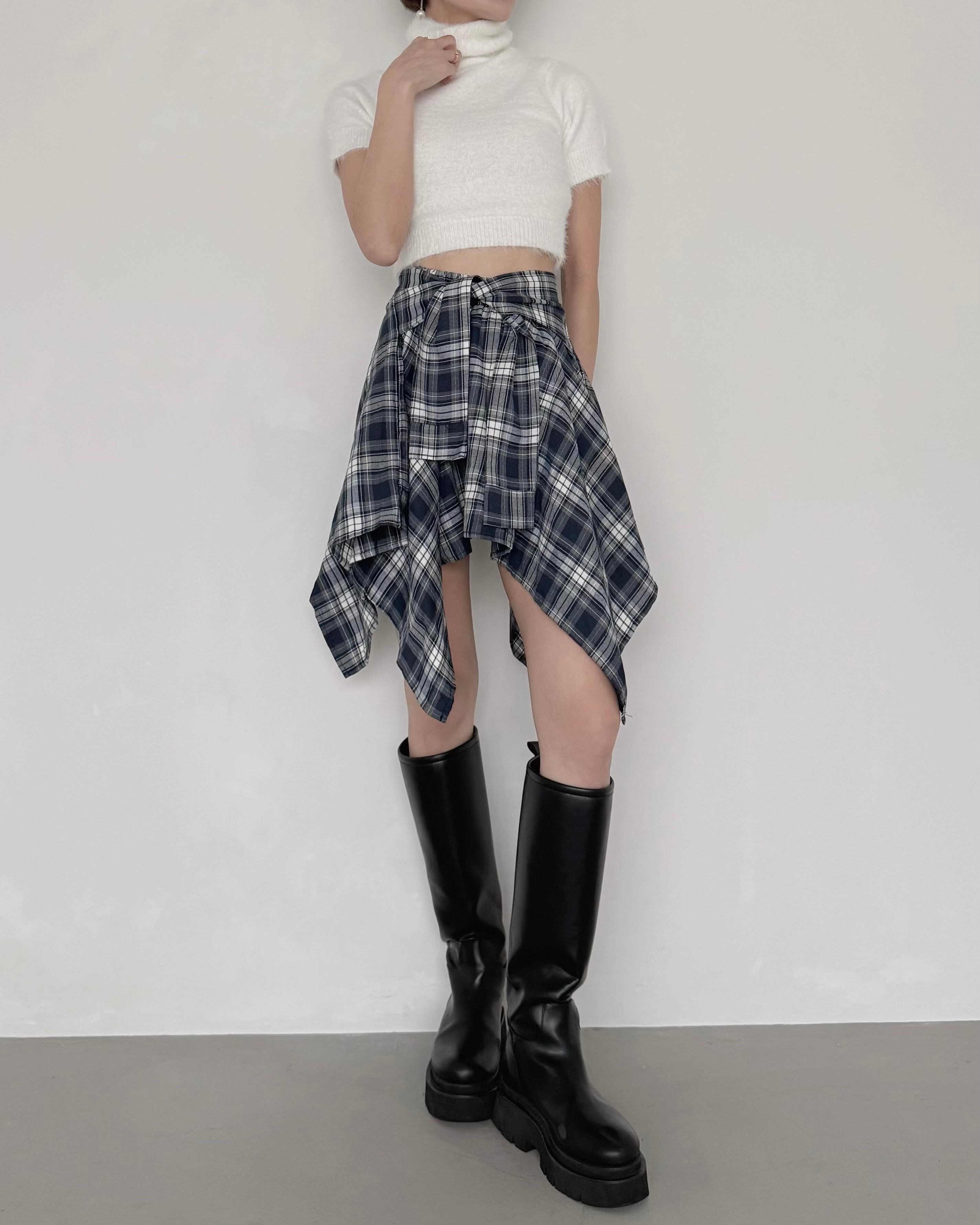 ハイウエストのボトムやボリュームスカートとのスタイリングで、都会的な雰囲気に。
