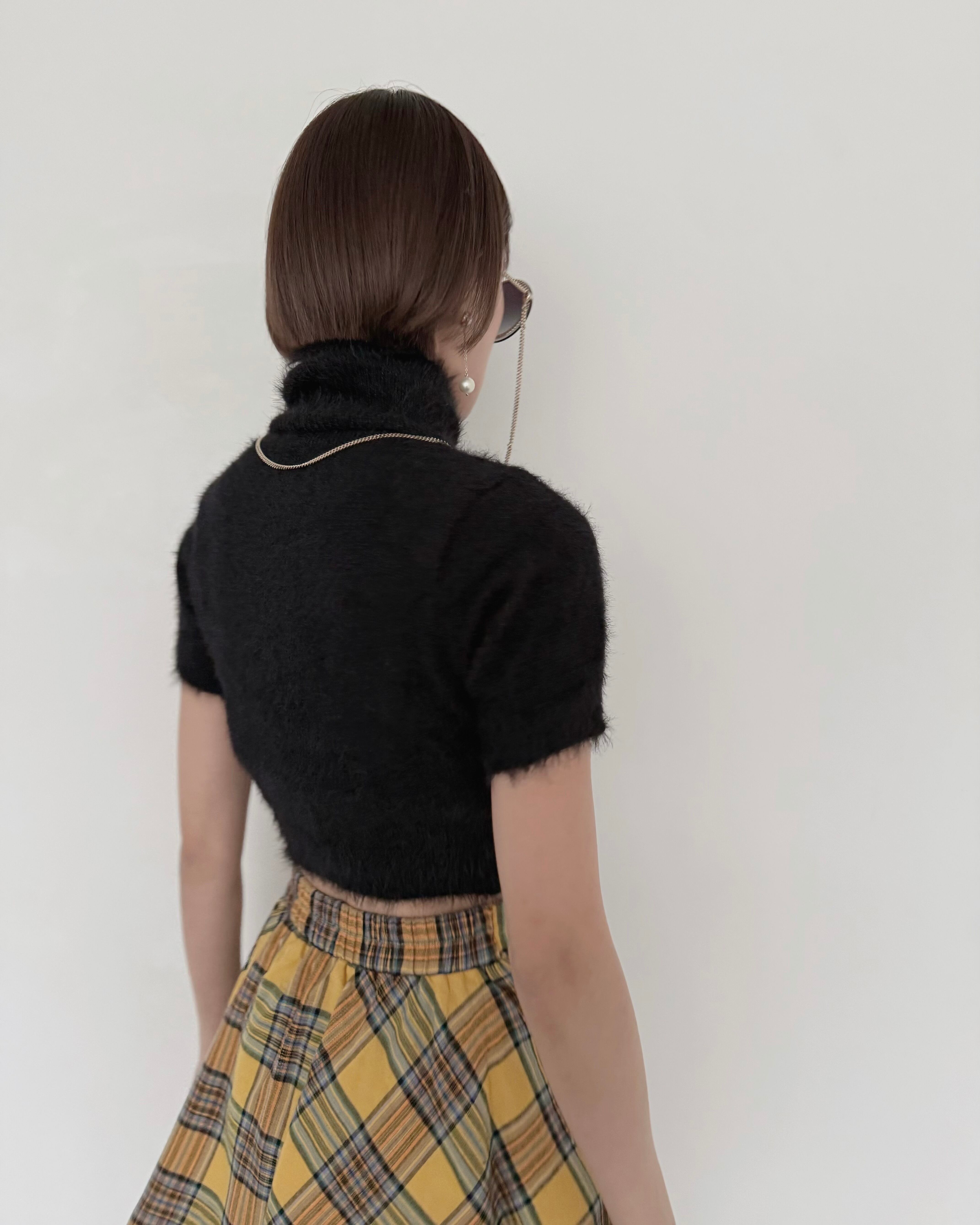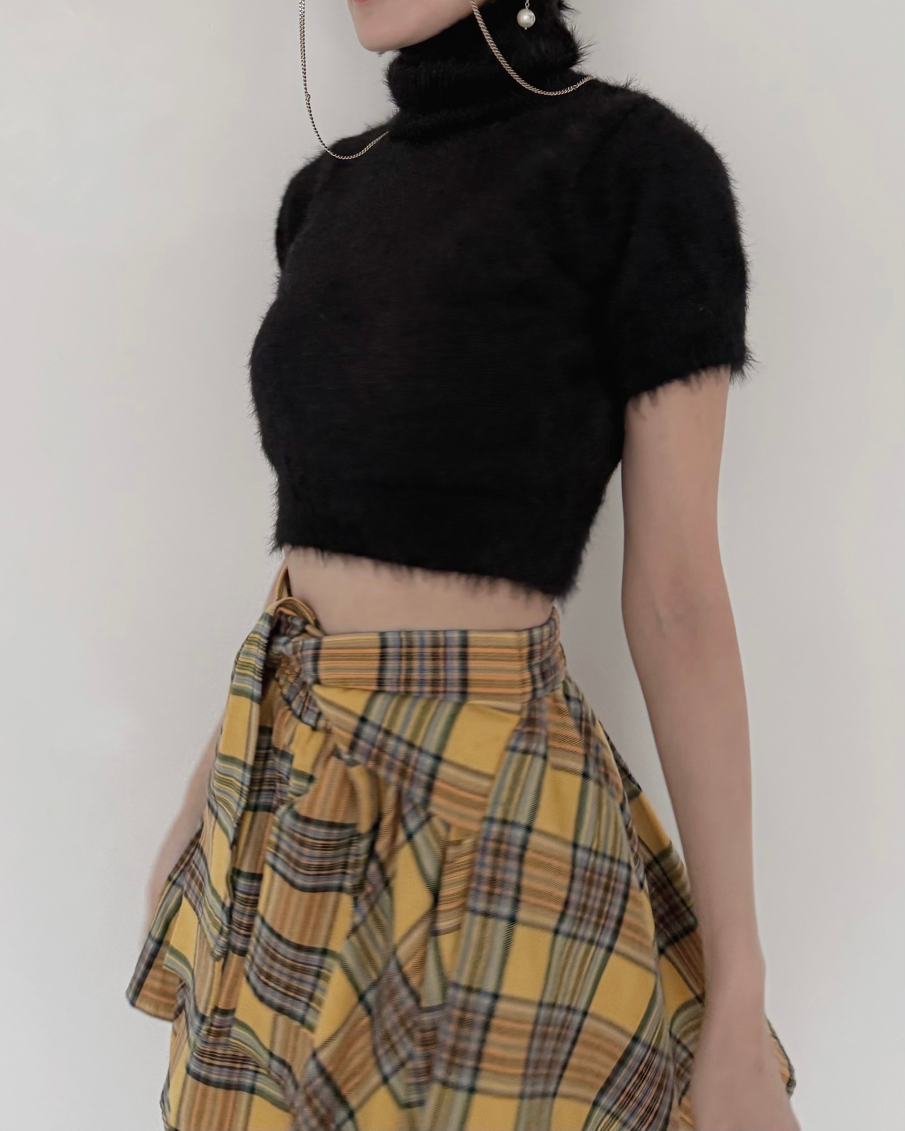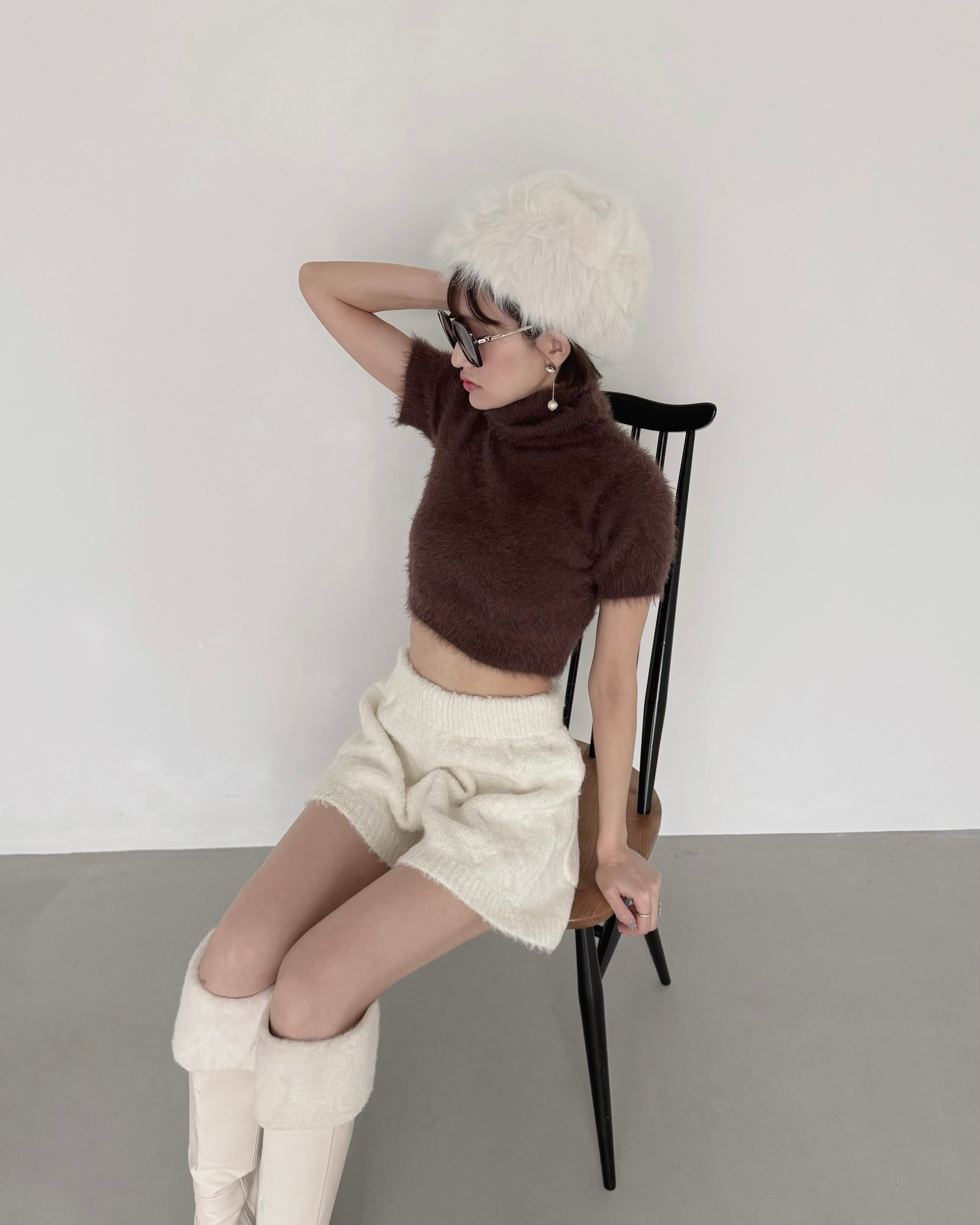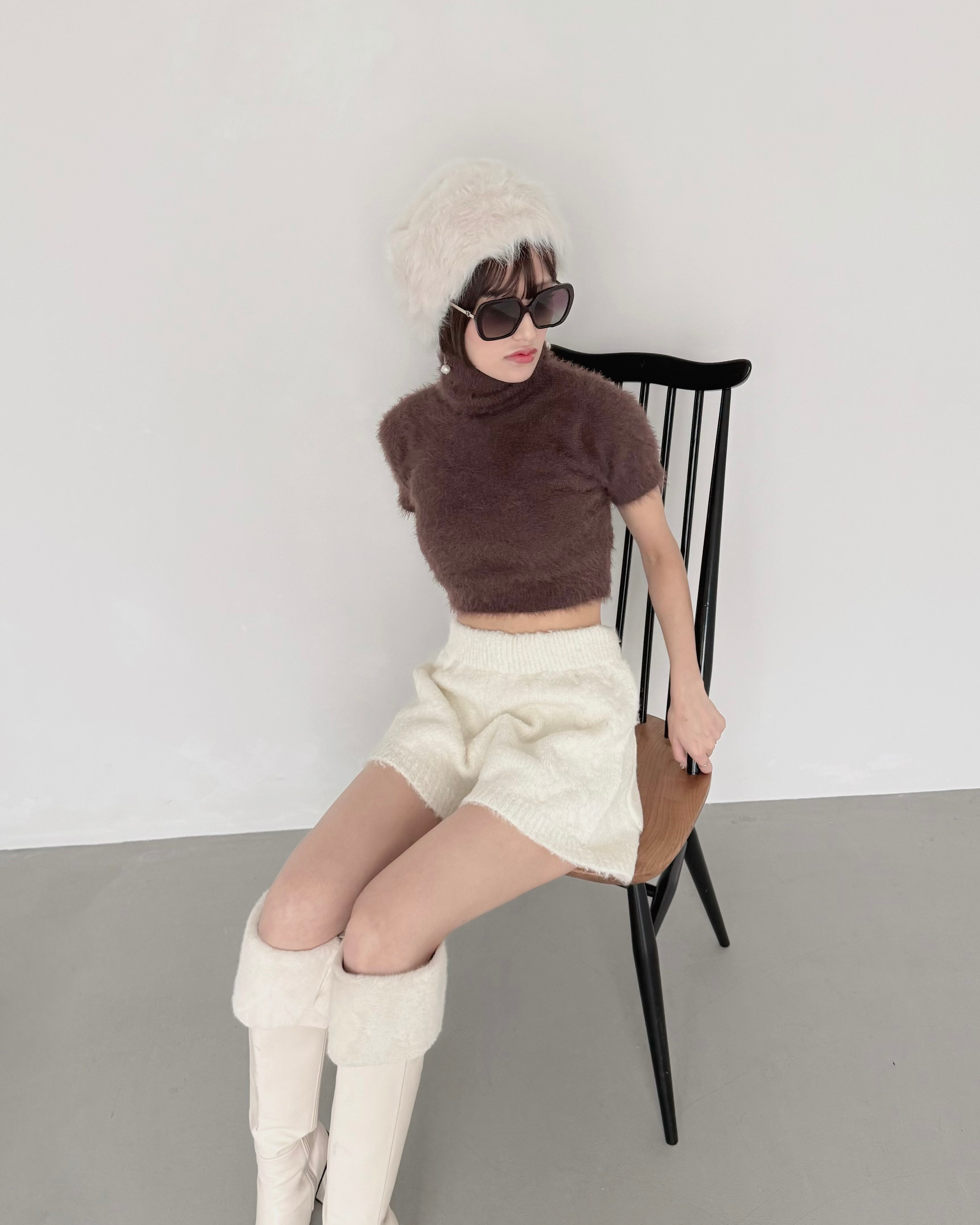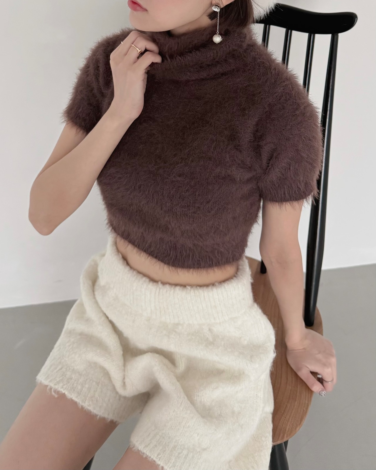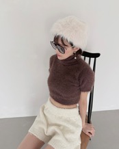 モードなムード漂う、ショート丈のシャギーニットトップス。