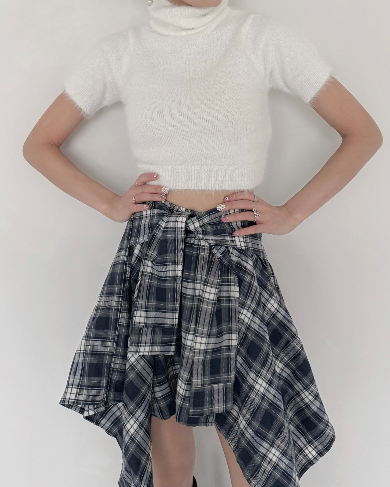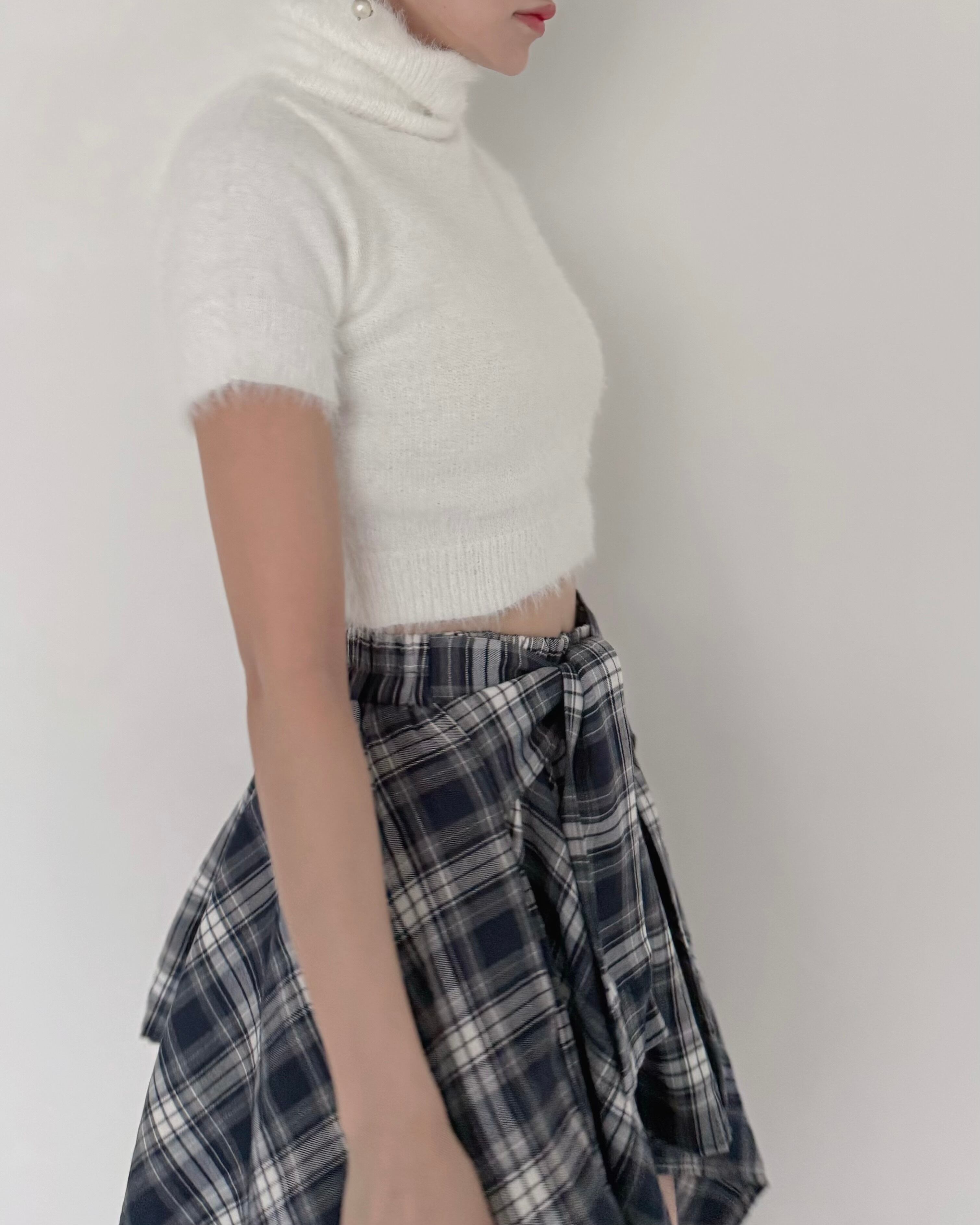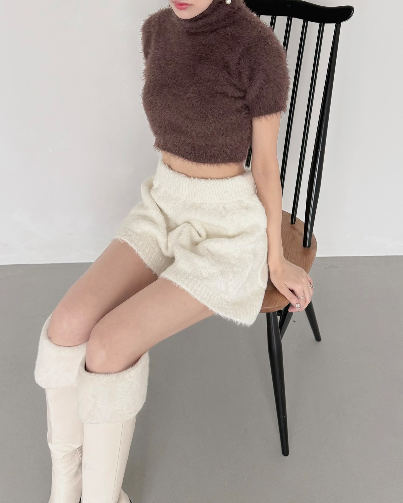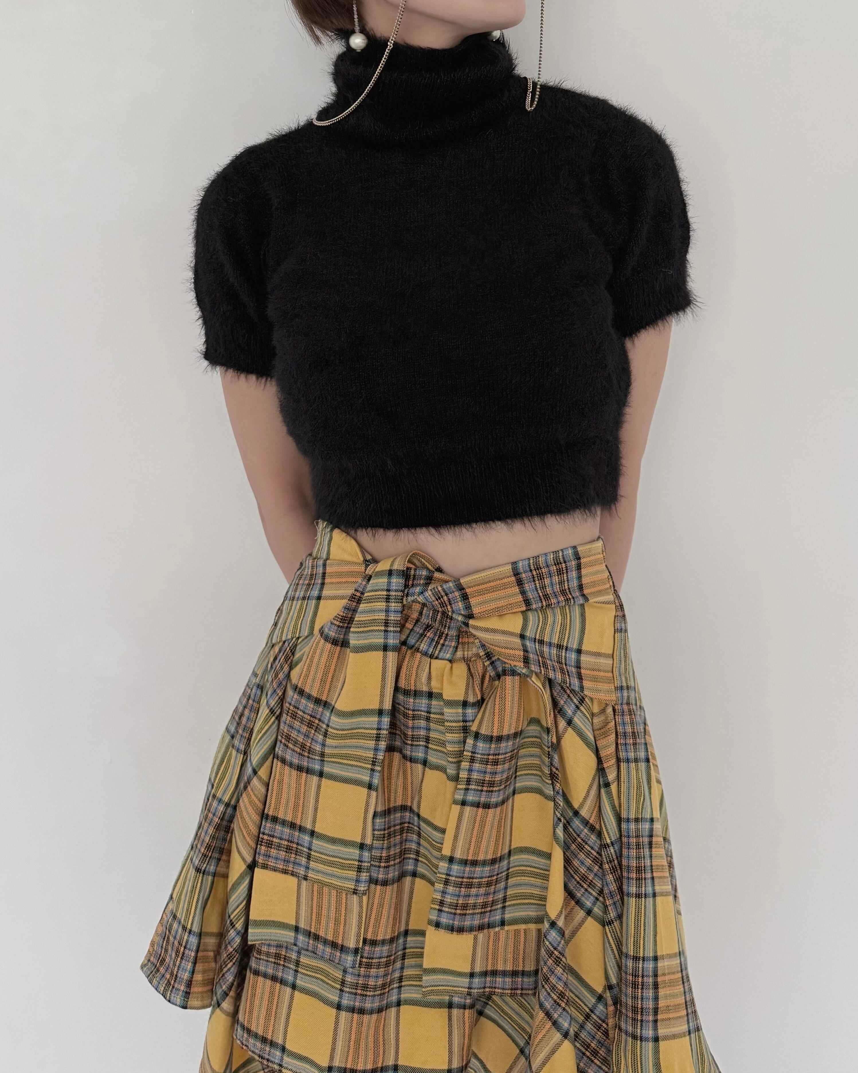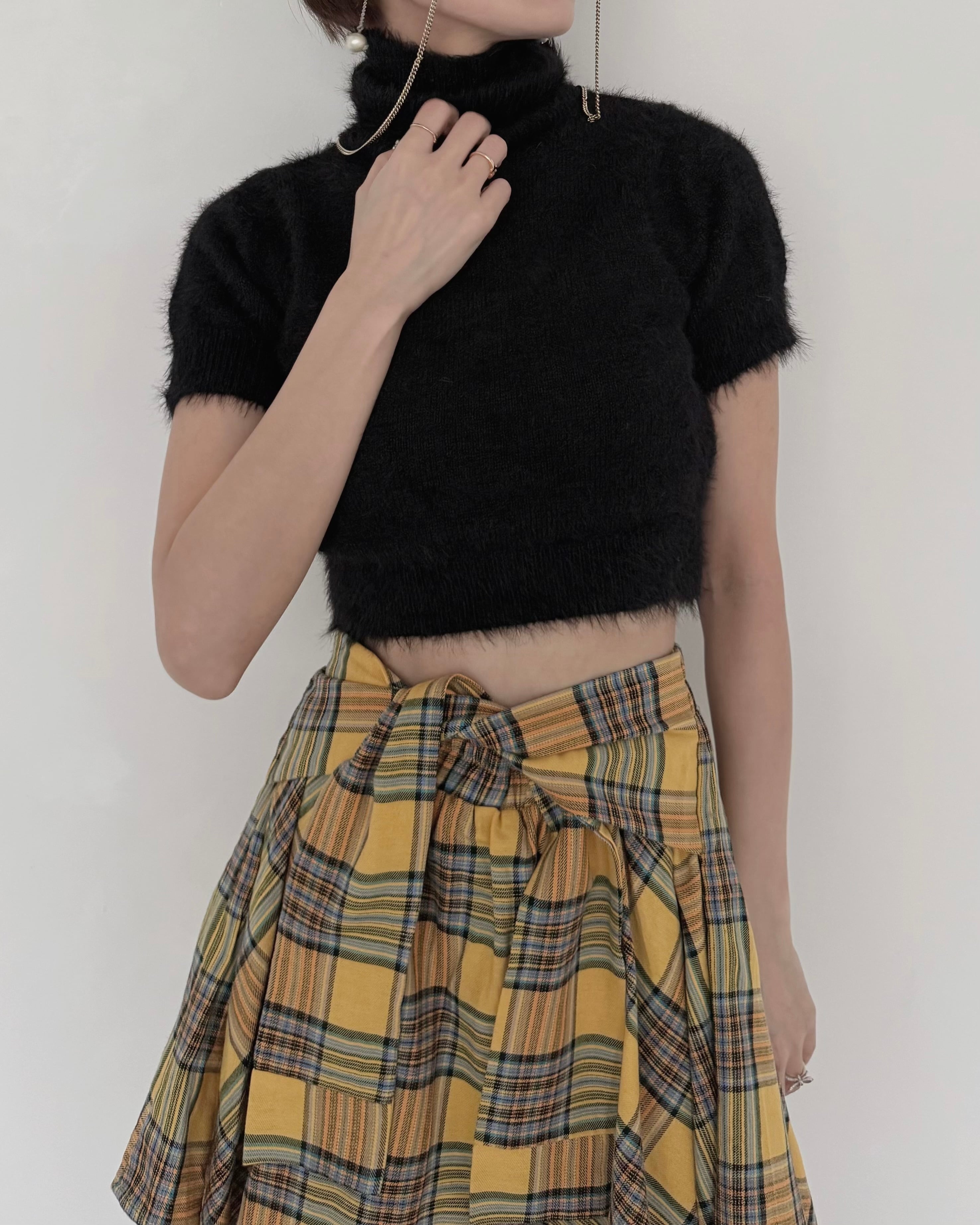 モードなムード漂う、ショート丈のシャギーニットトップス。