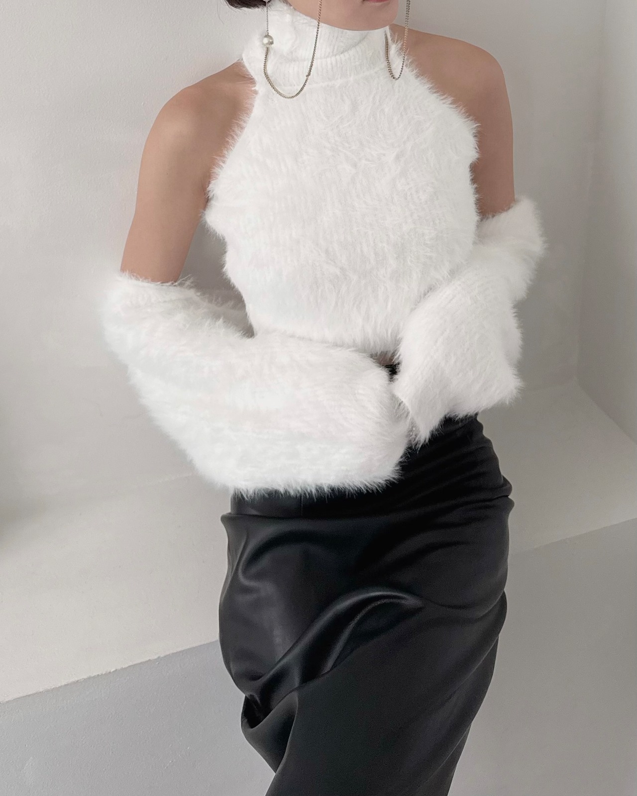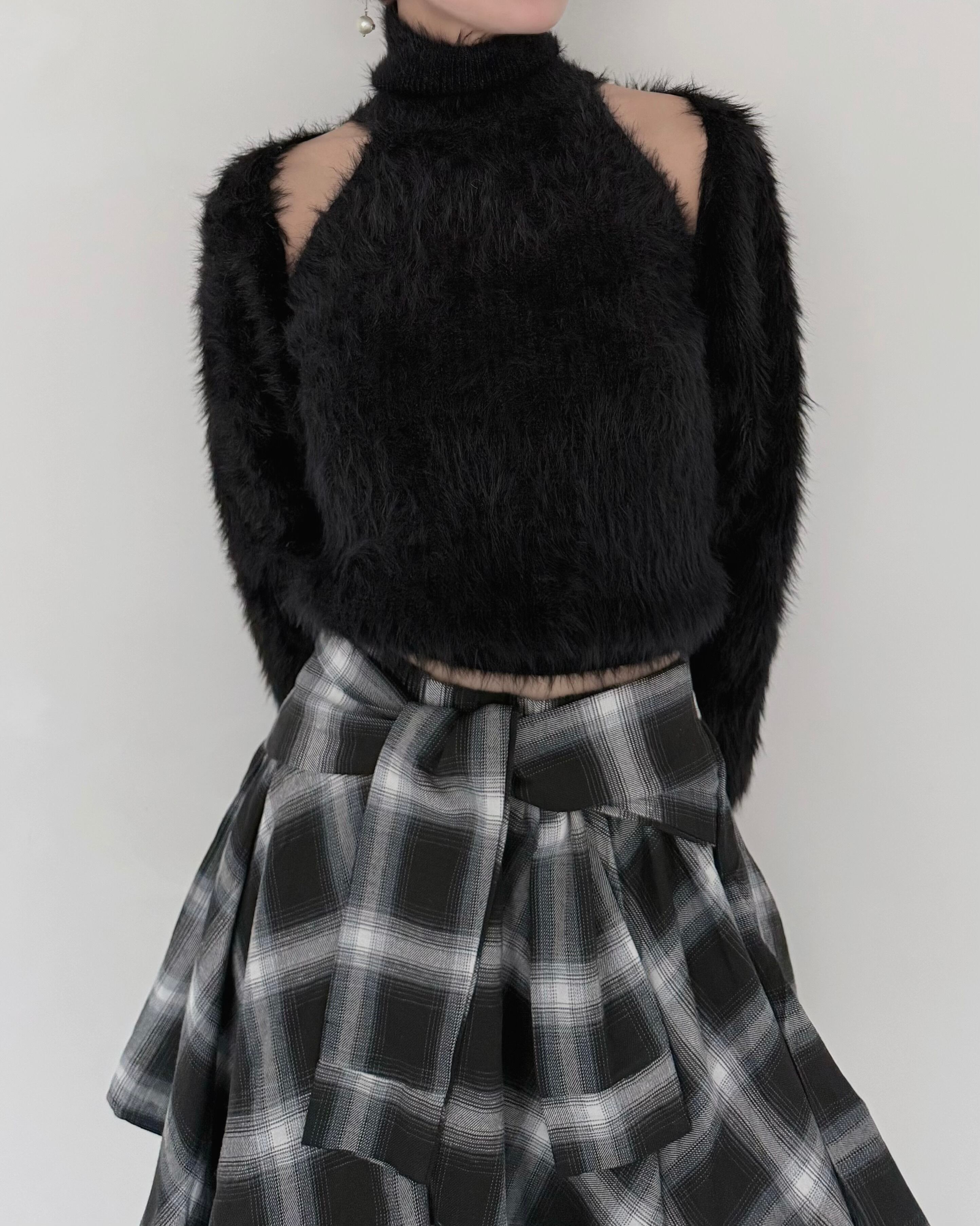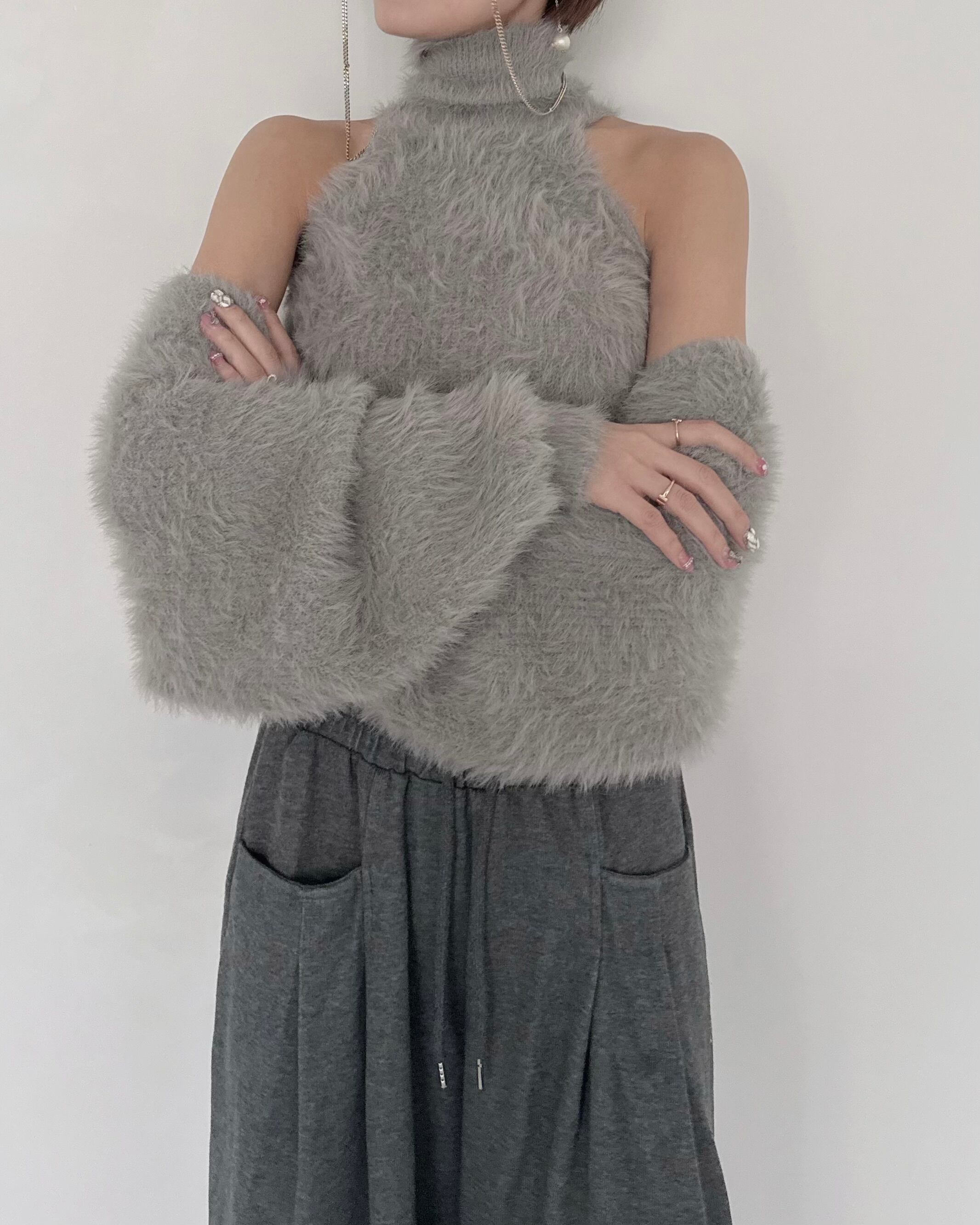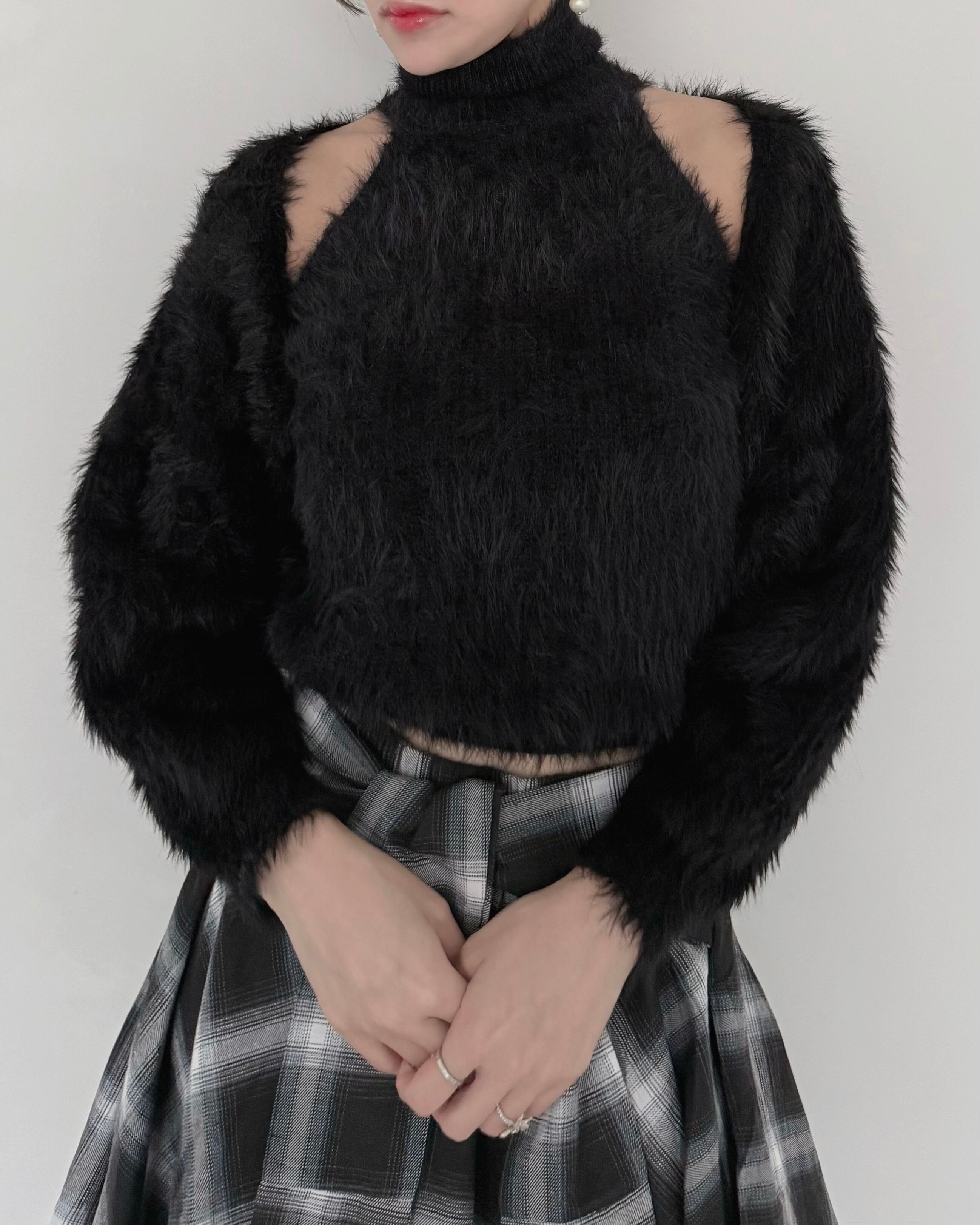 ふわふわ感と程よい肌見せのバランスが絶妙なシャギーニットのアンサンブル。