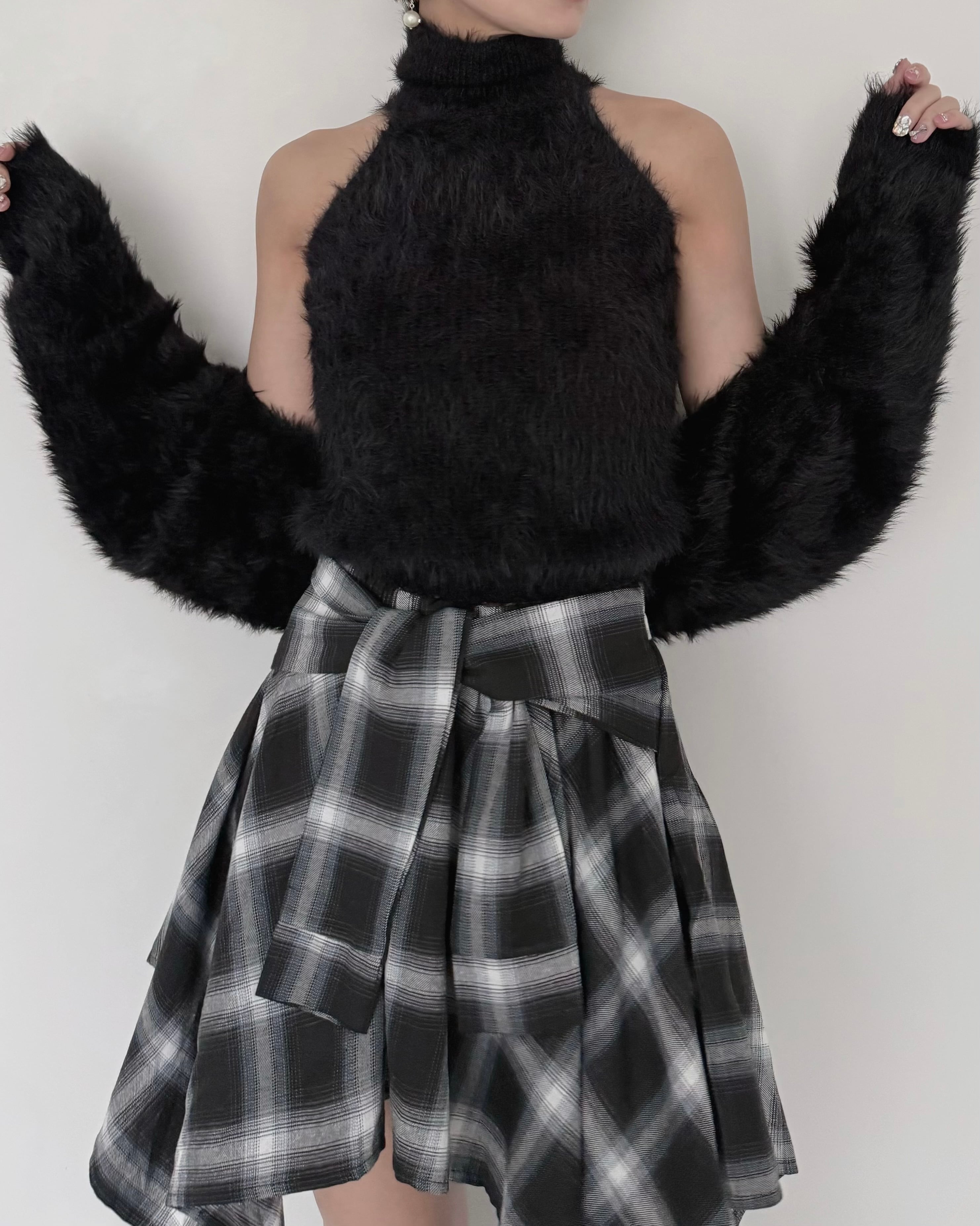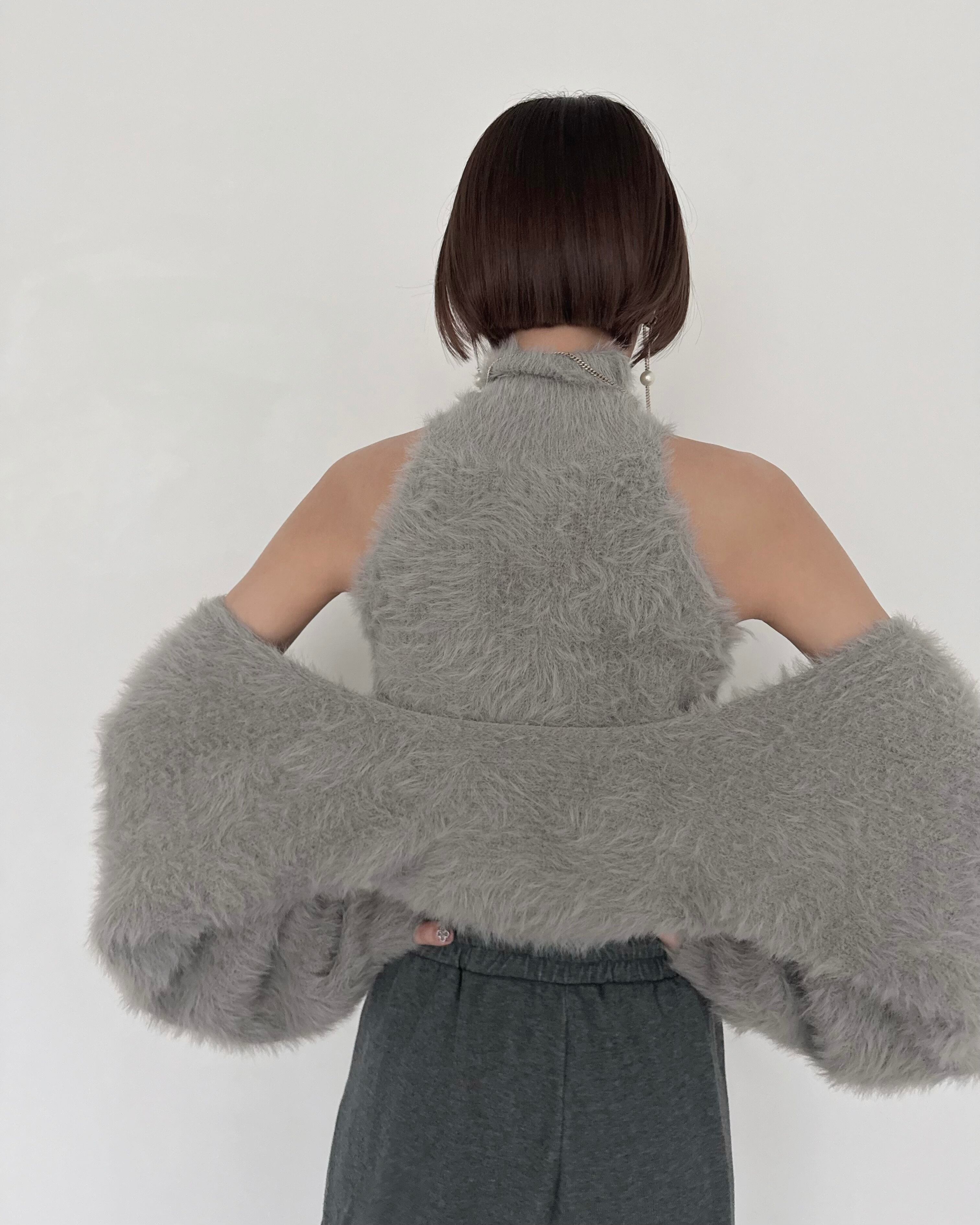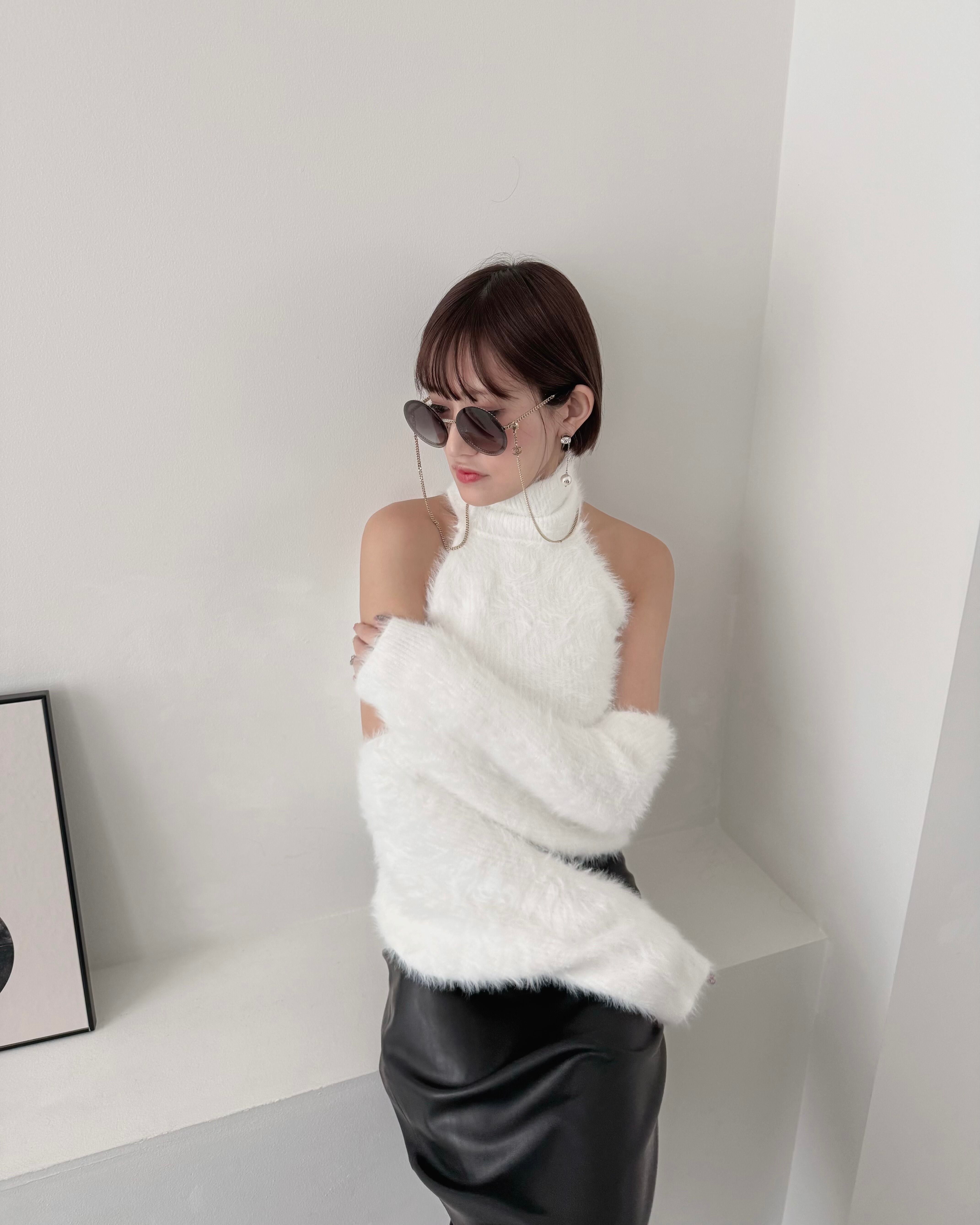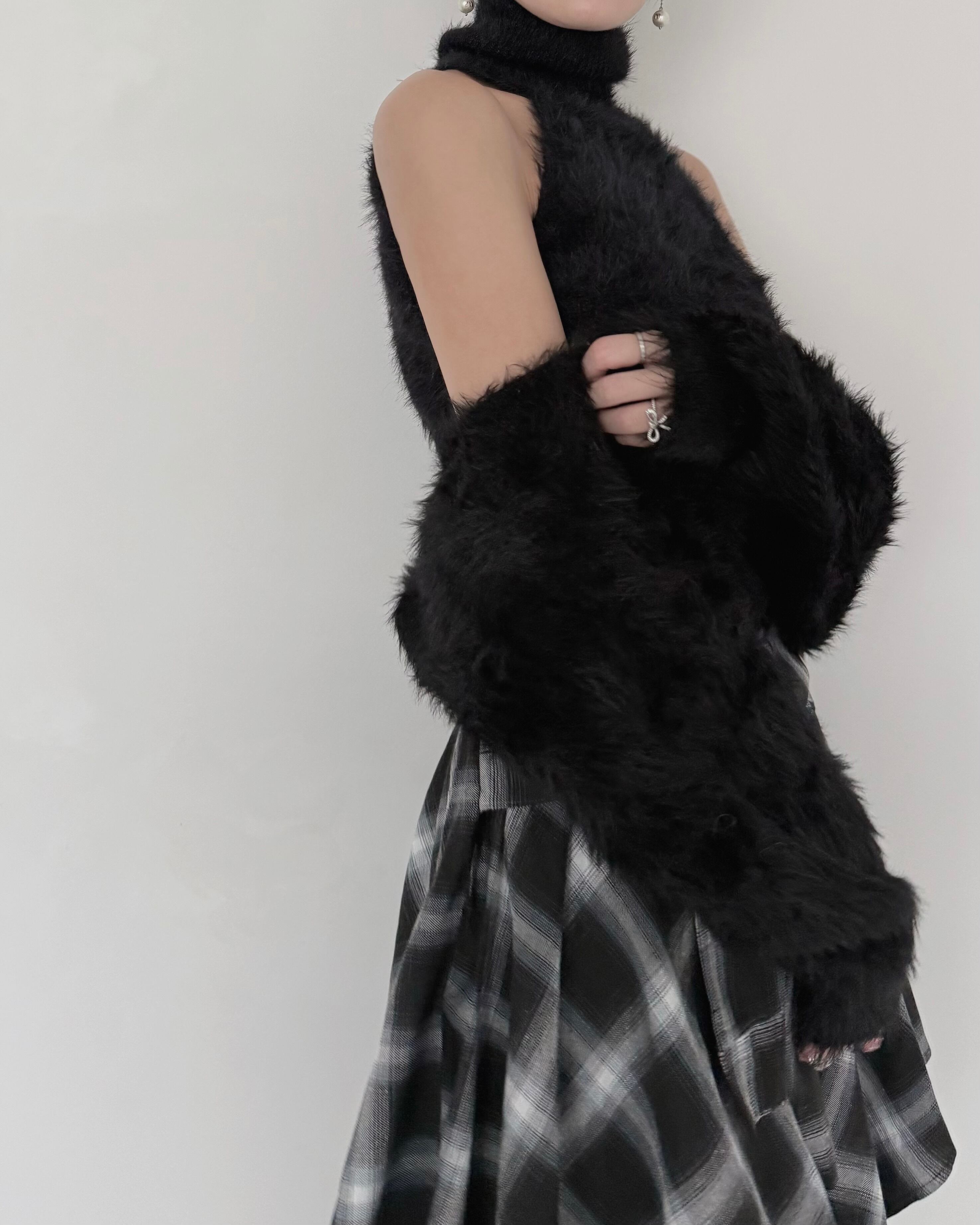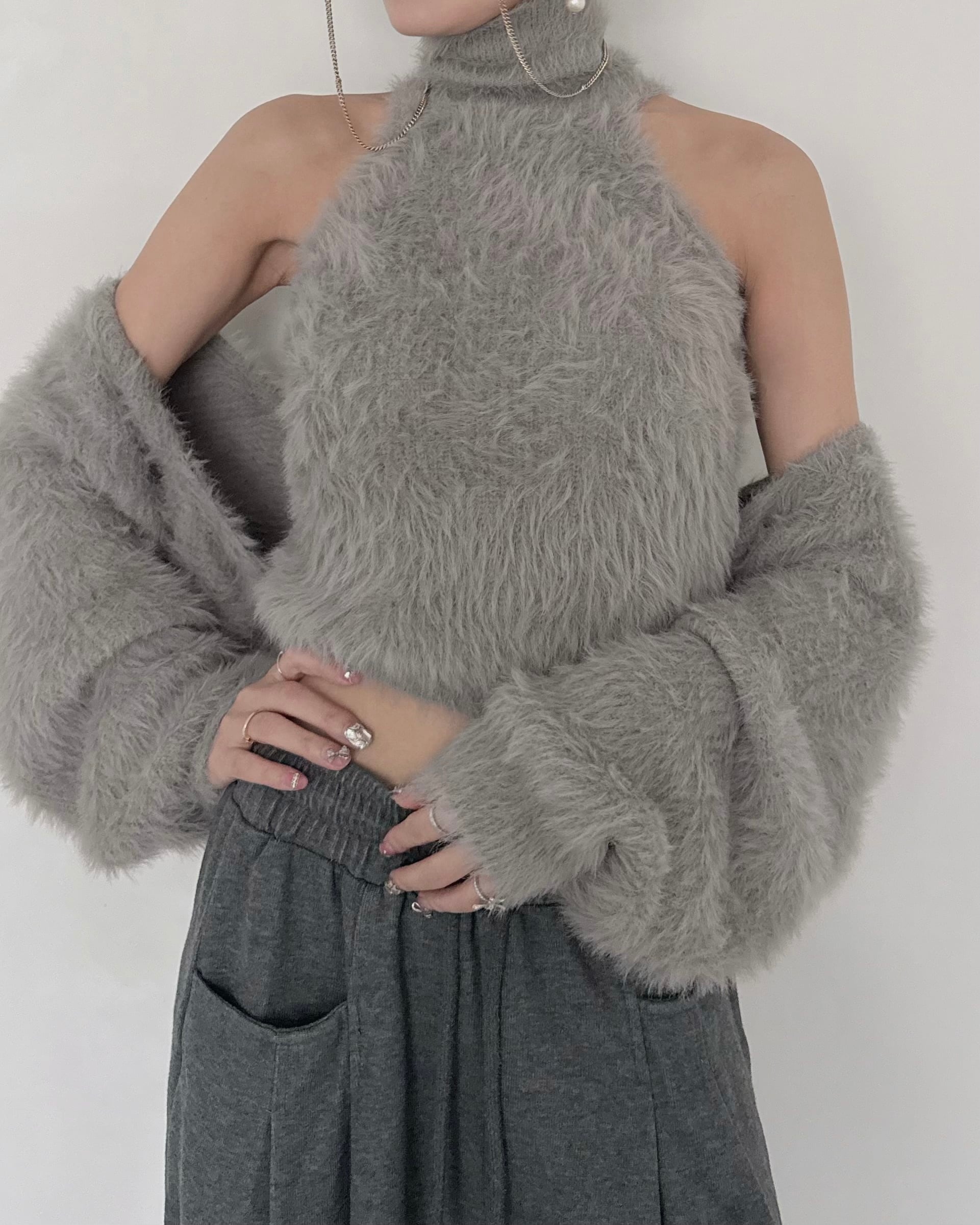 ふわふわ感と程よい肌見せのバランスが絶妙なシャギーニットのアンサンブル。