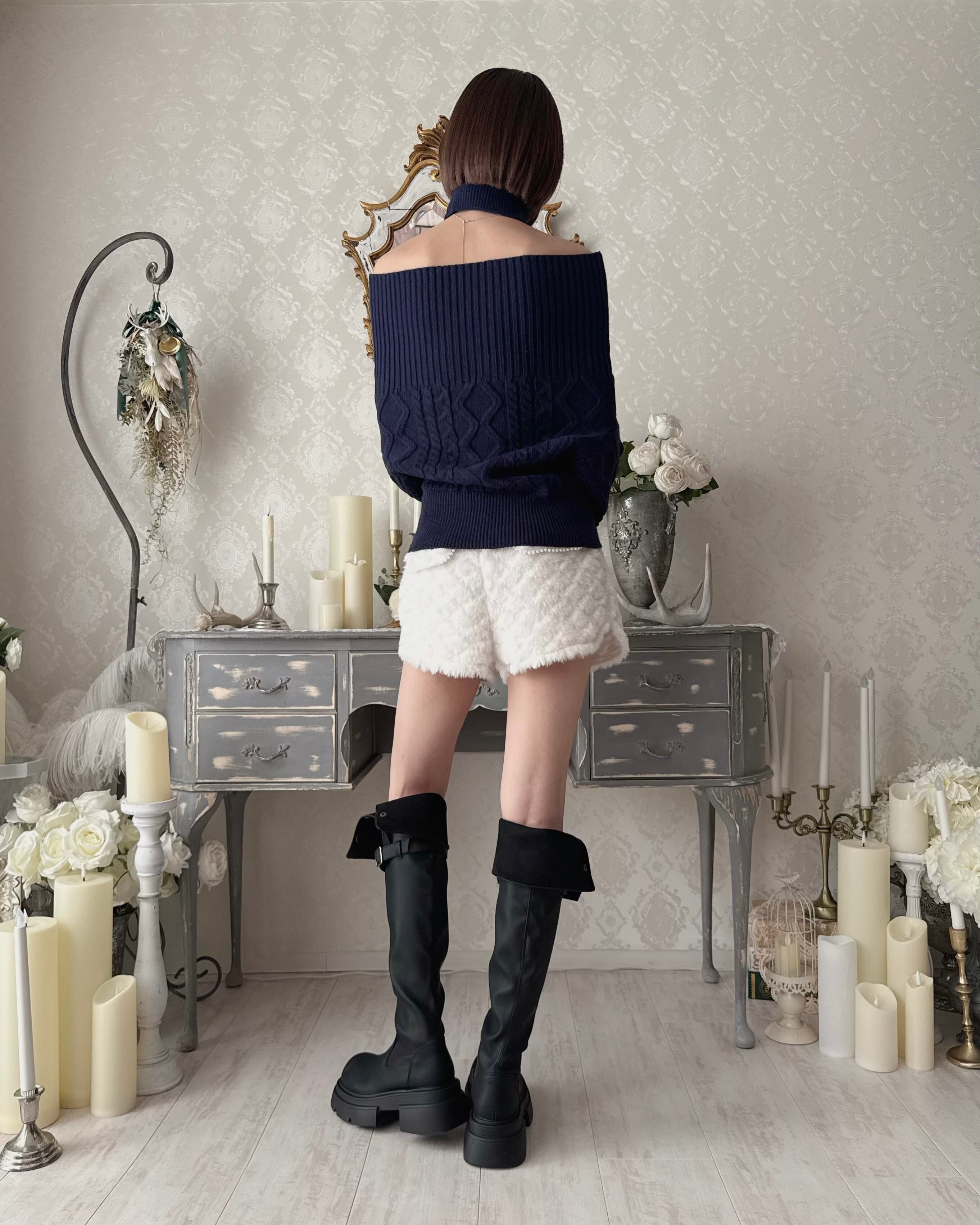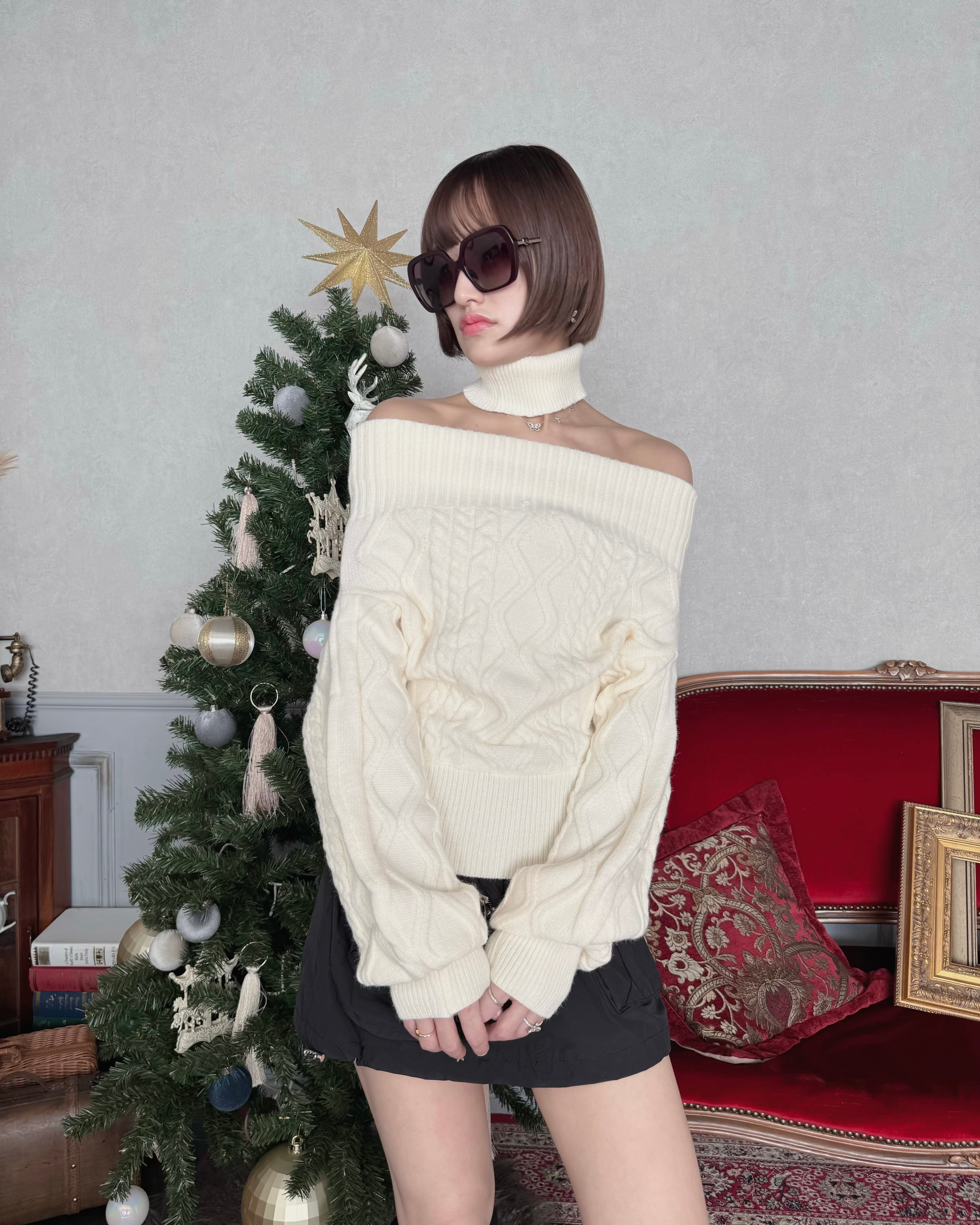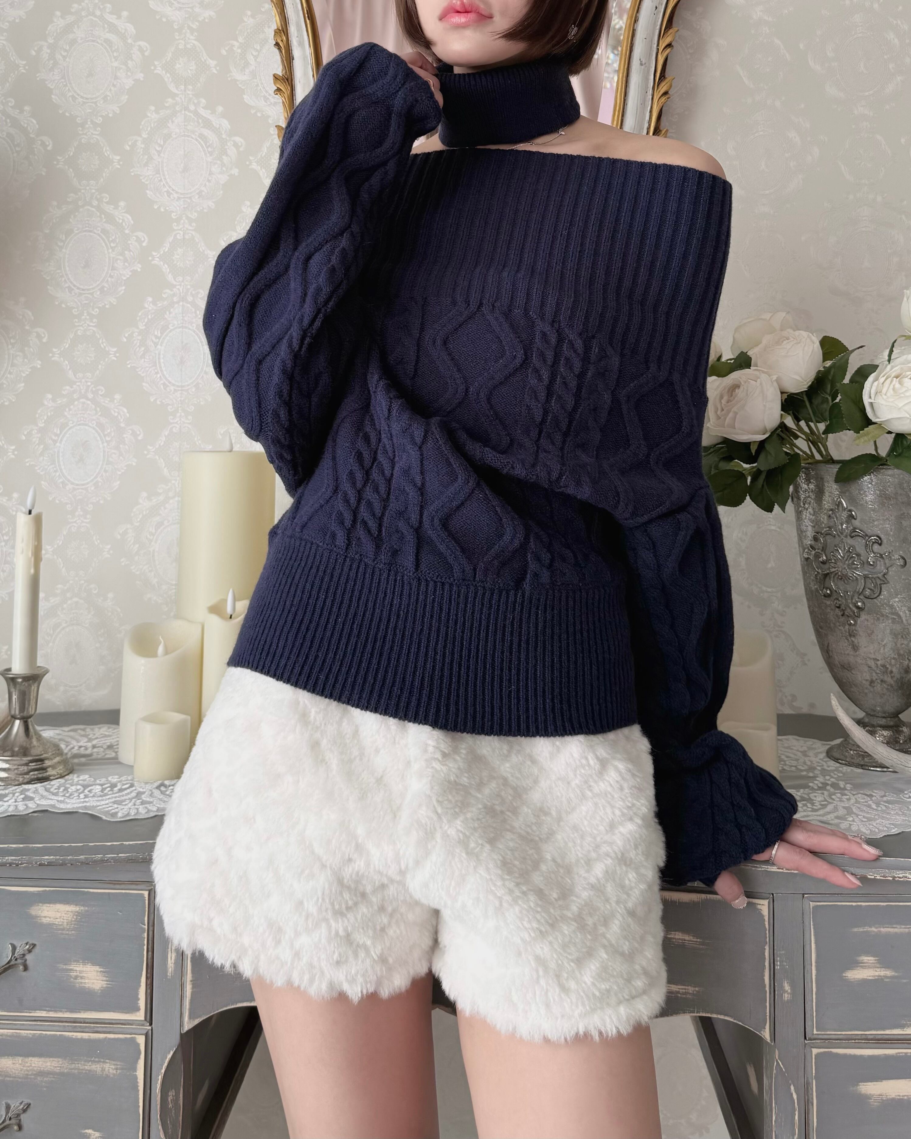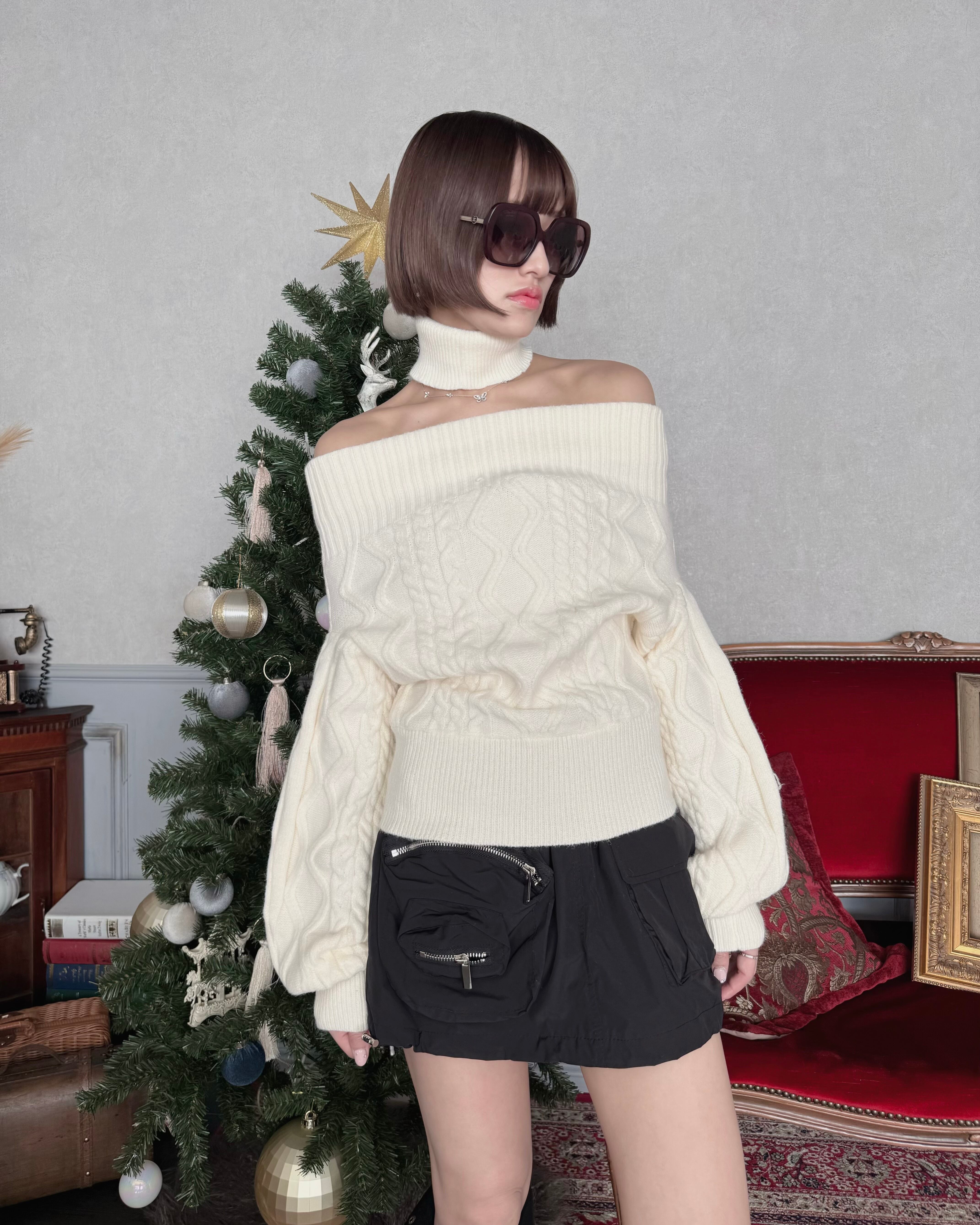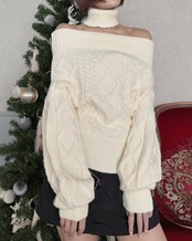 上品さとモード感を兼ね備えたオフショルダーニット。