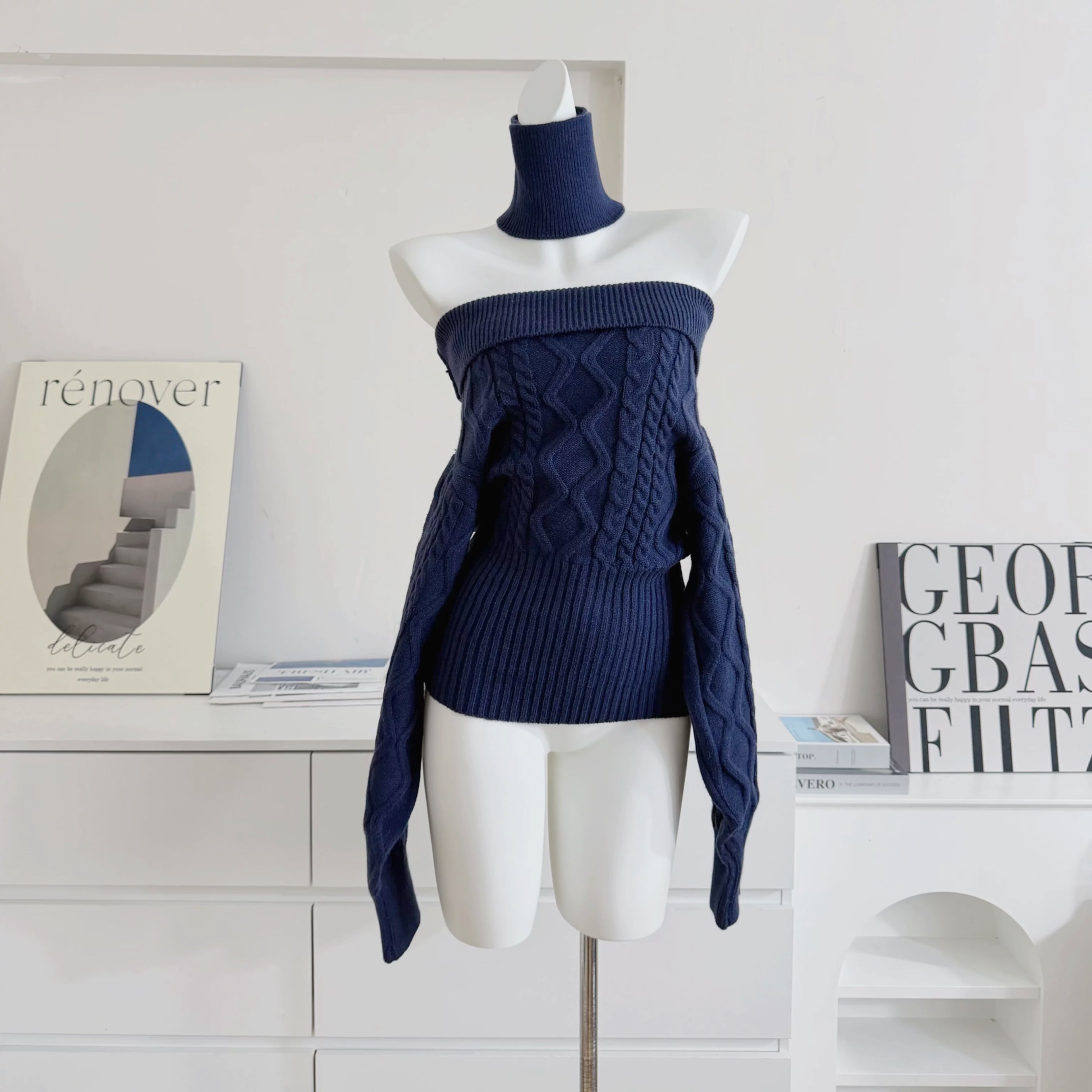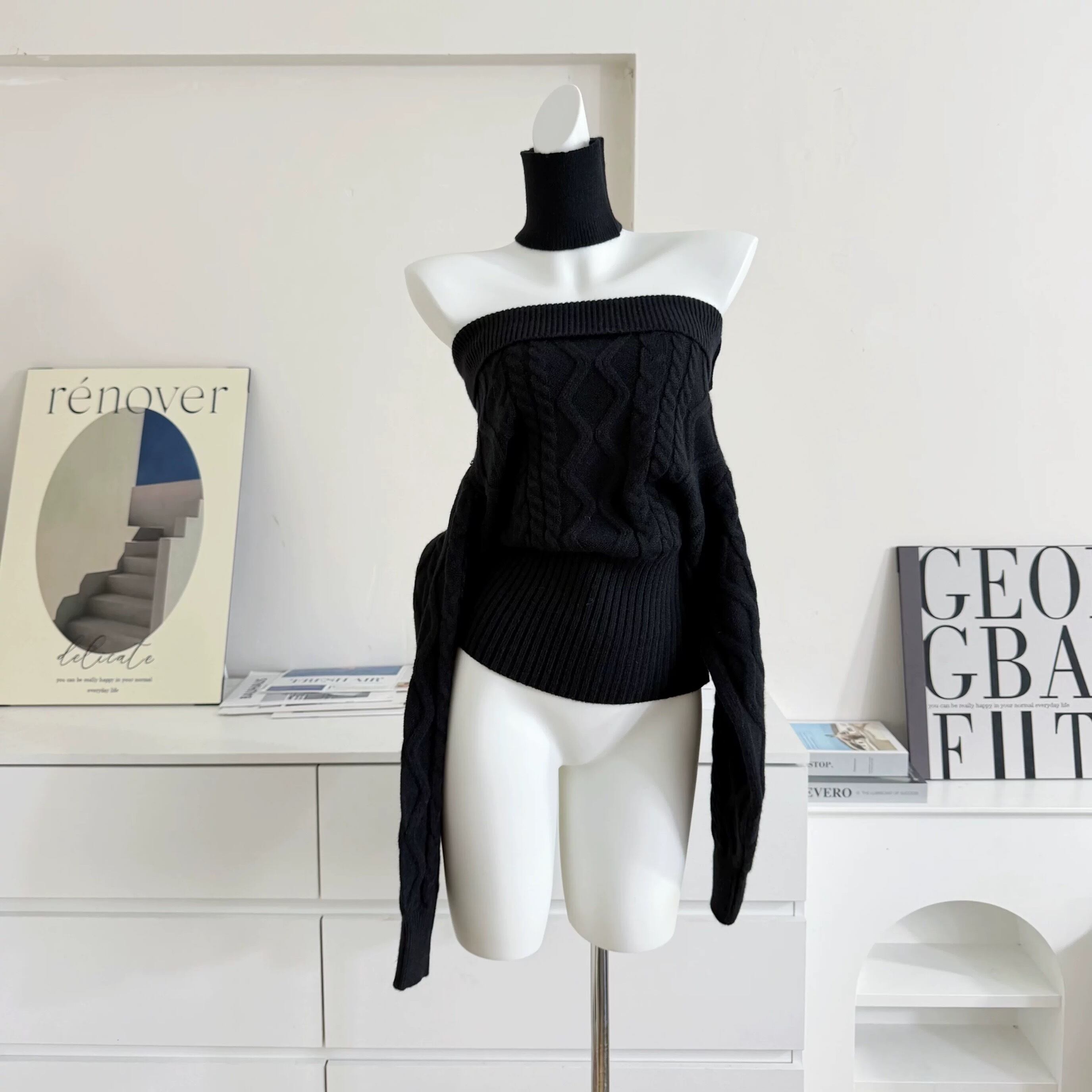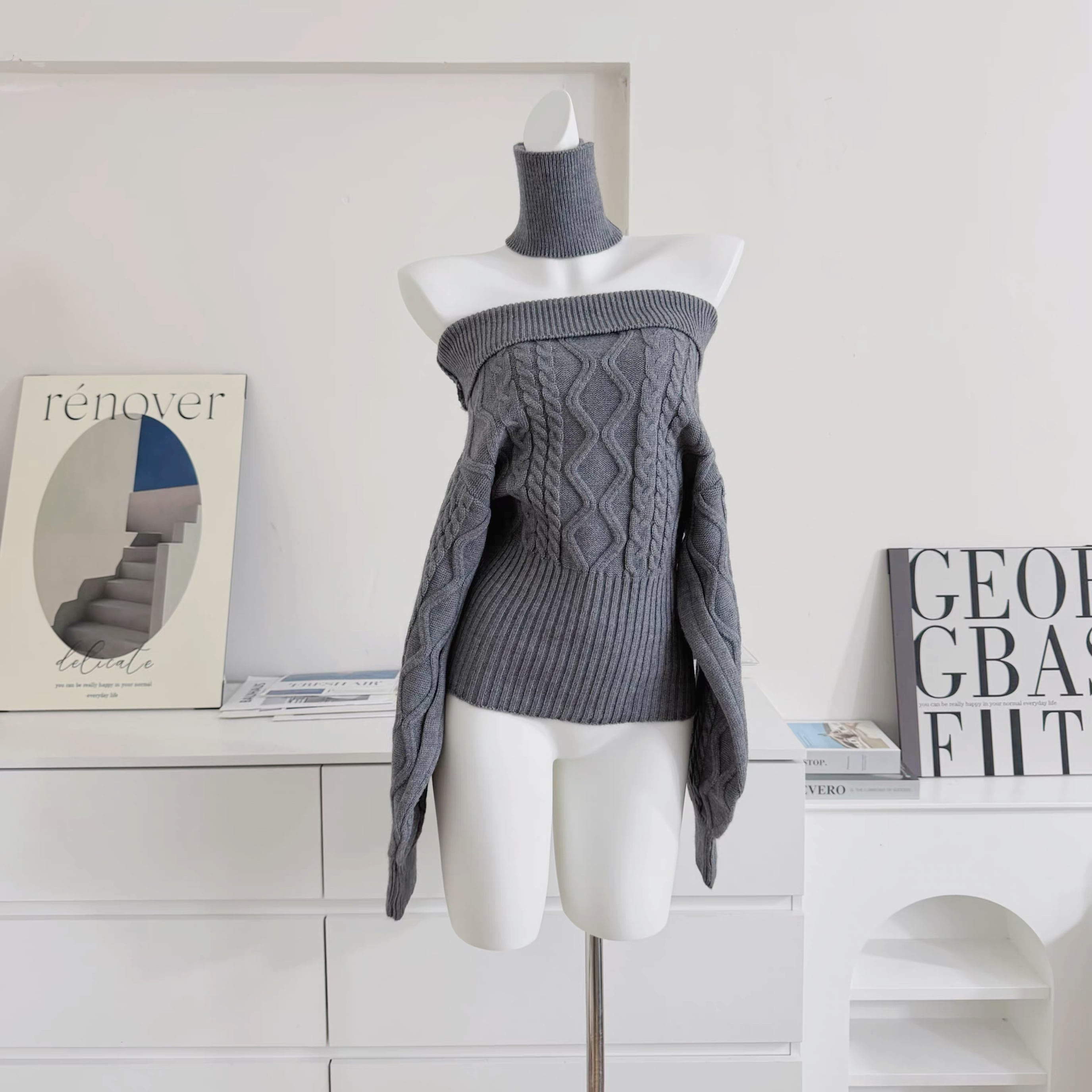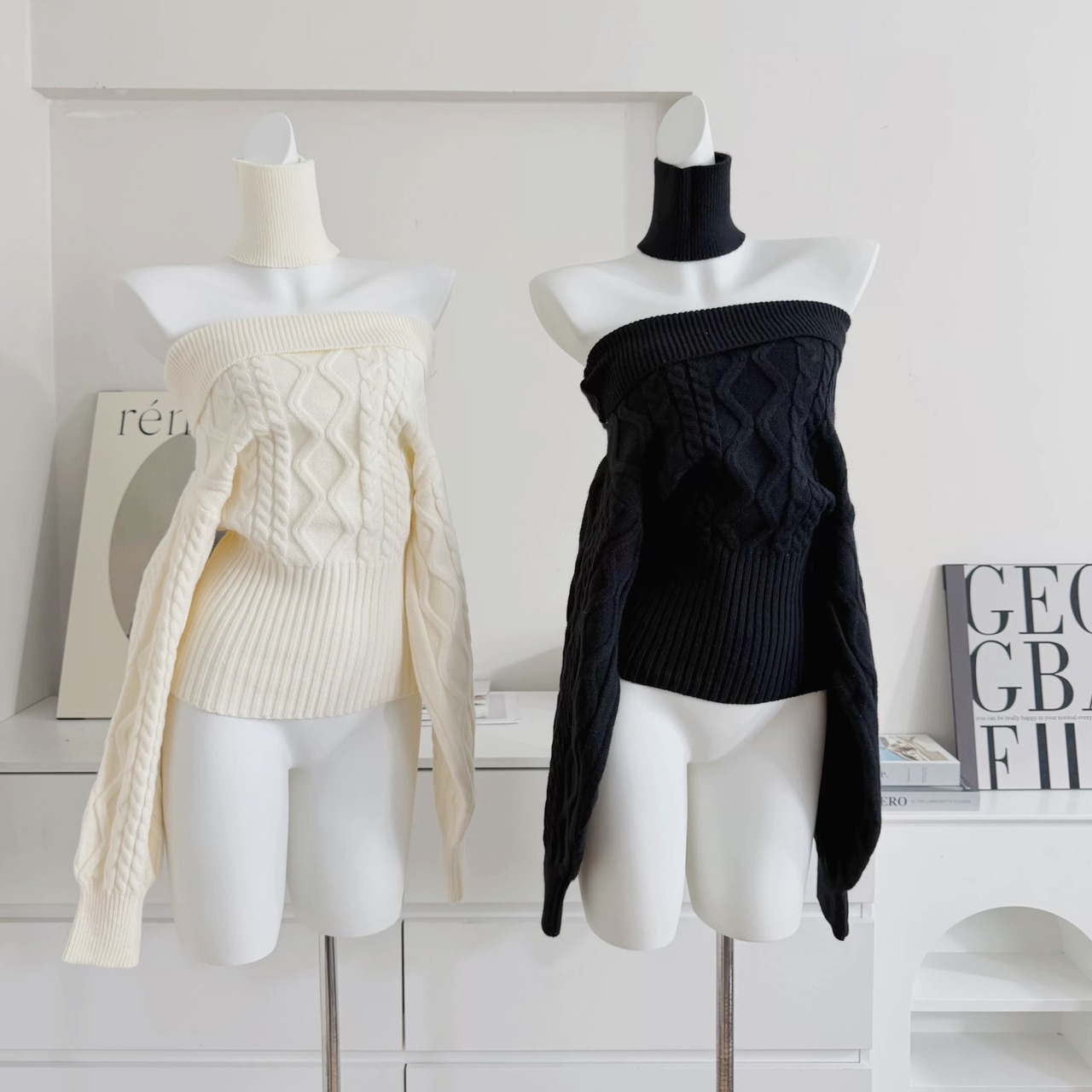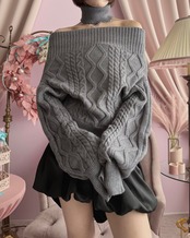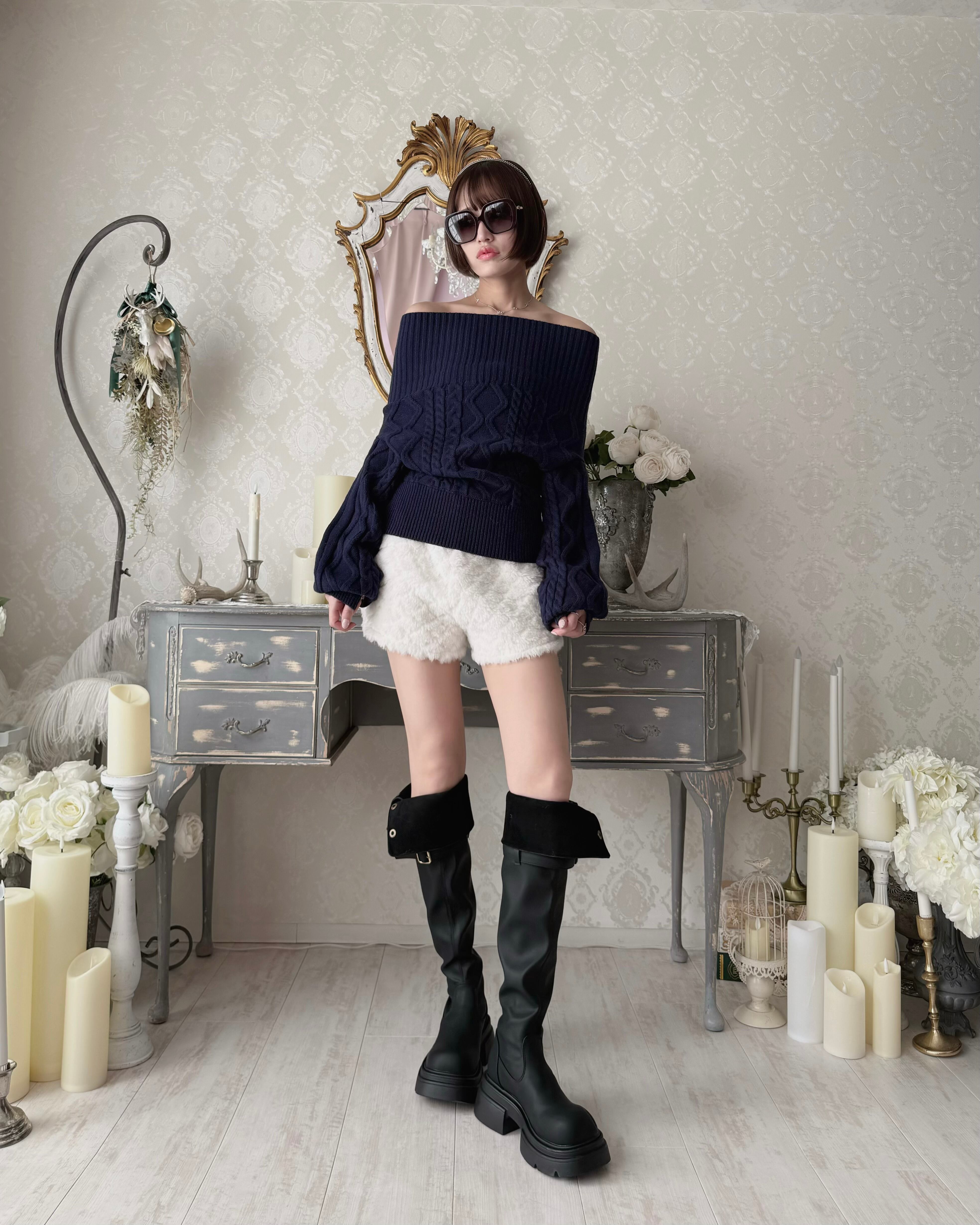 上品さとモード感を兼ね備えたオフショルダーニット。