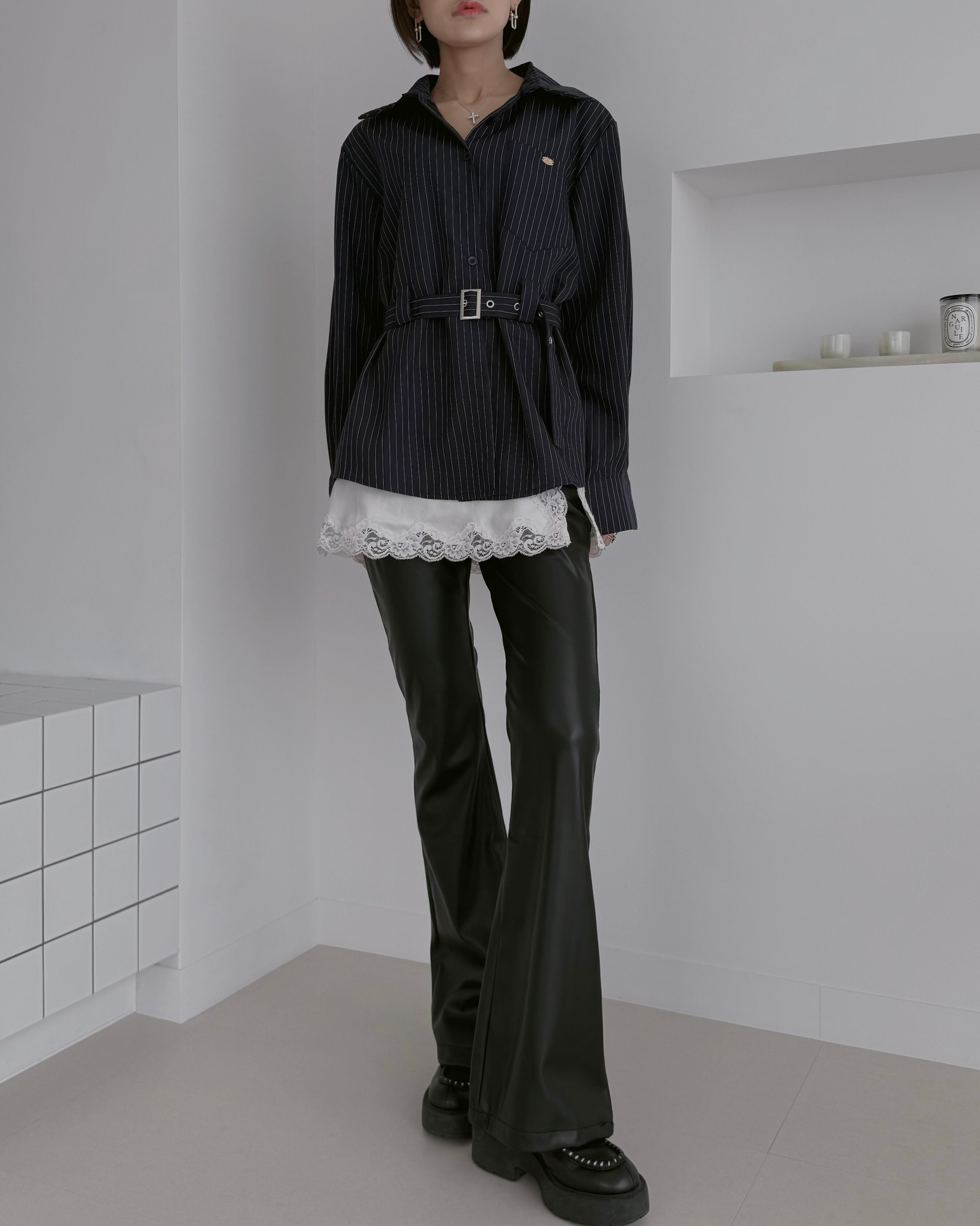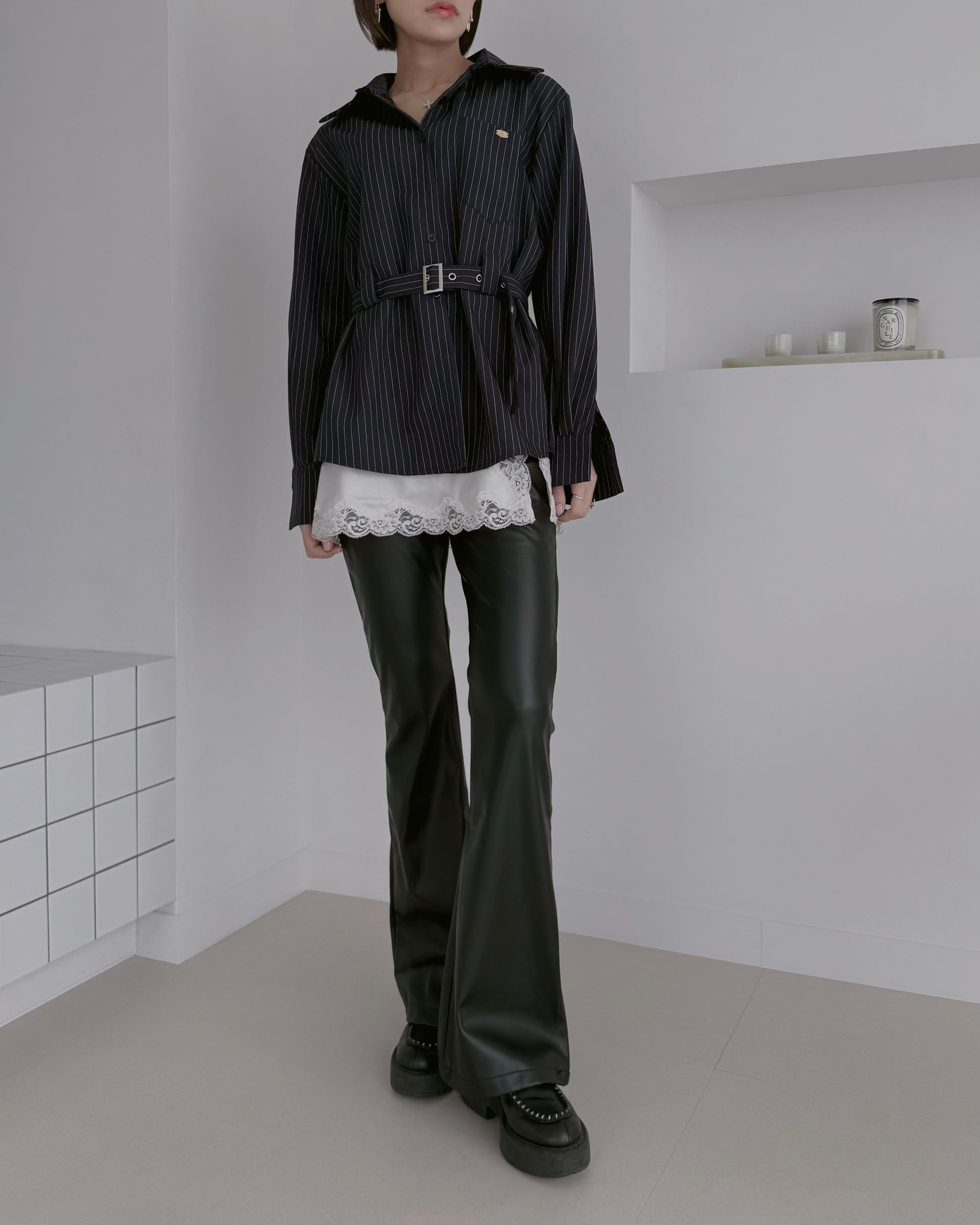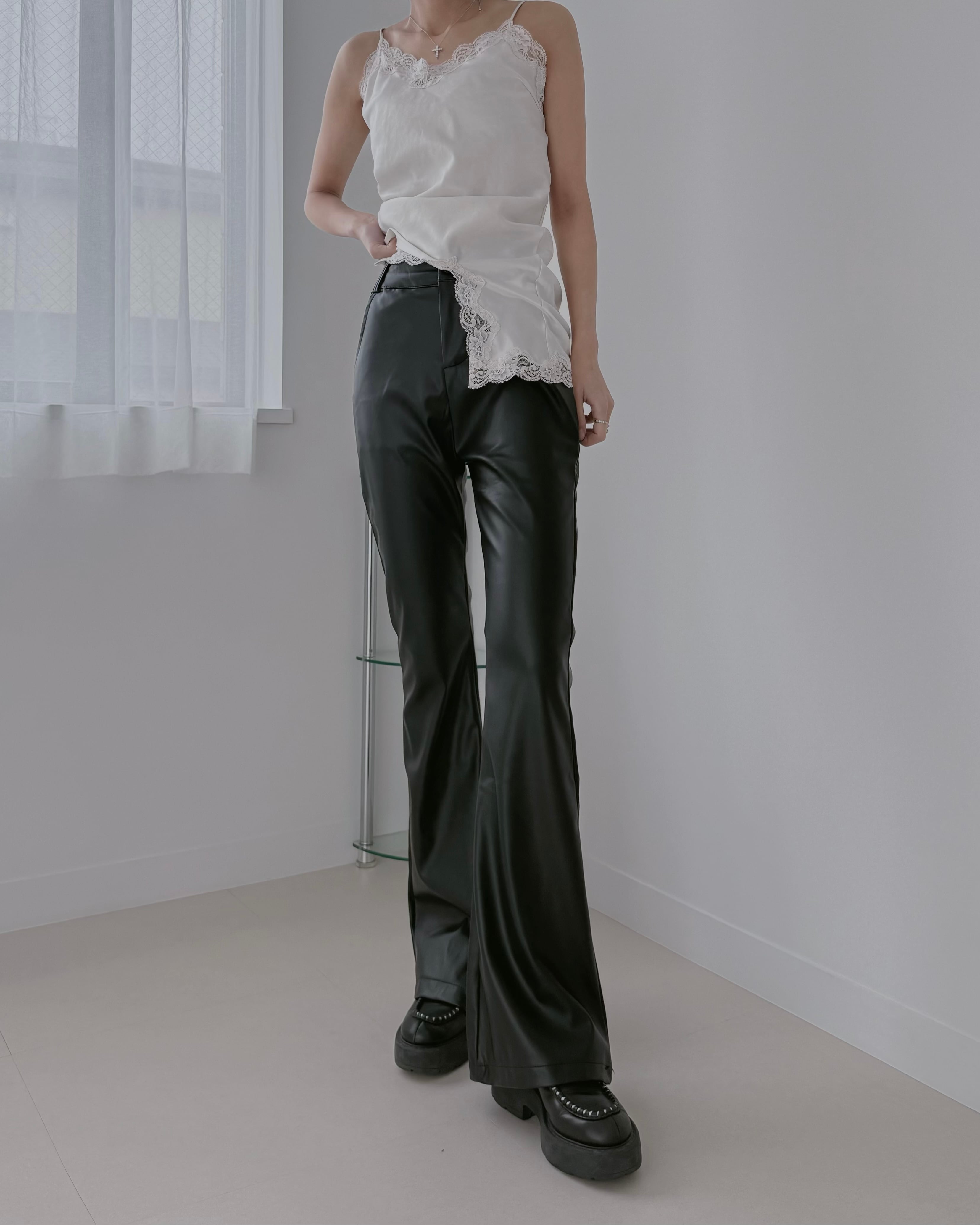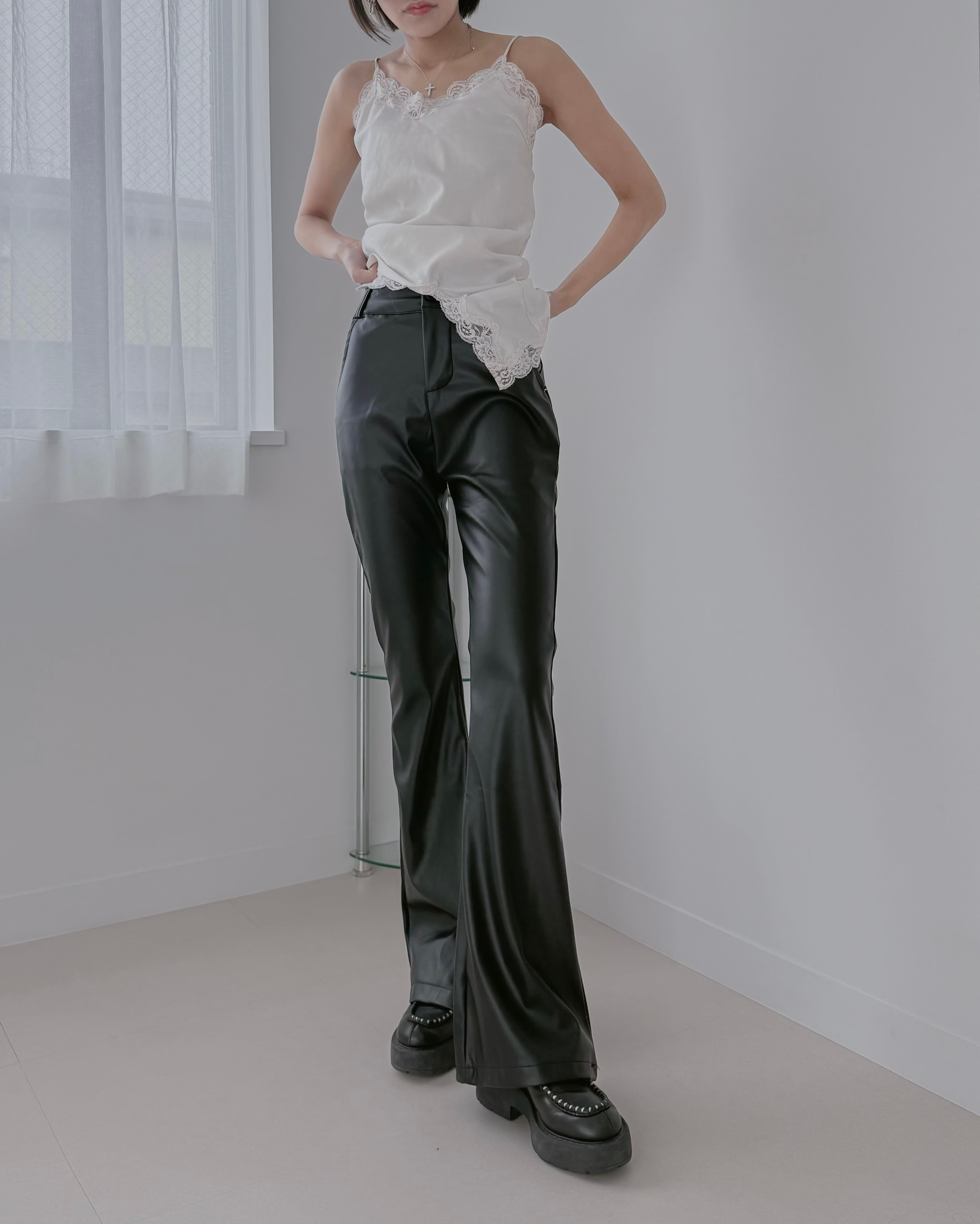 上品な光沢感が魅力のフェイクレザーフレアパンツ。