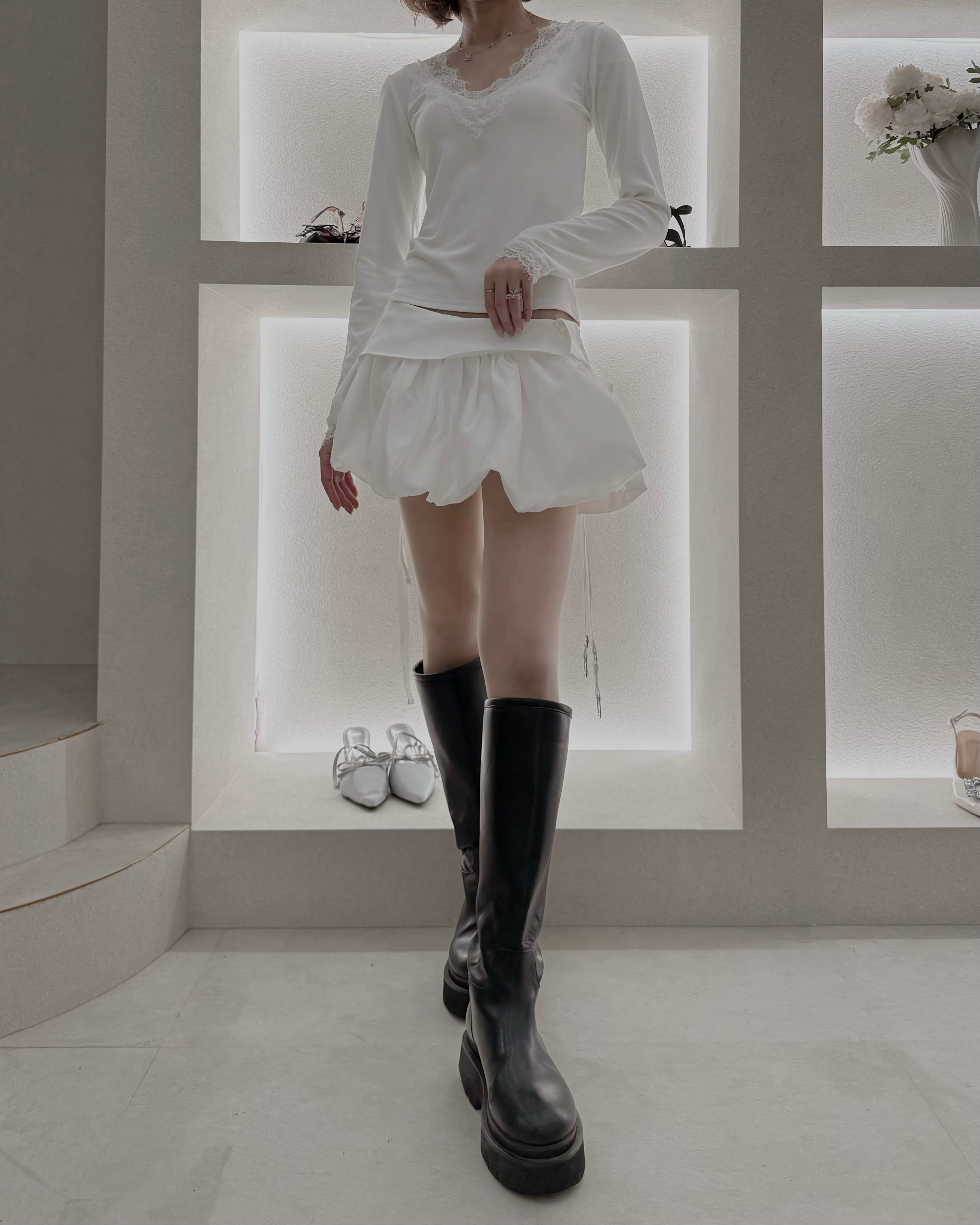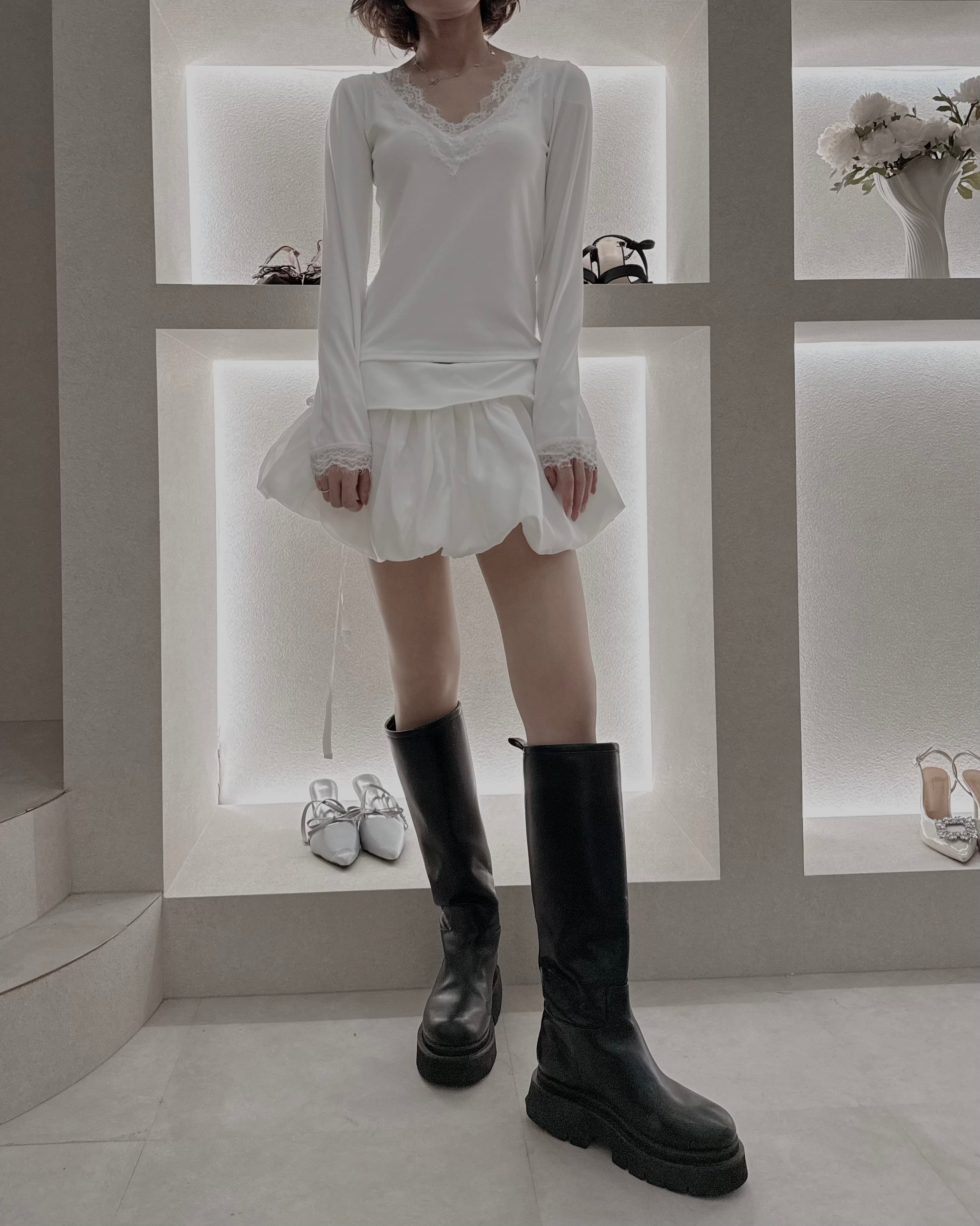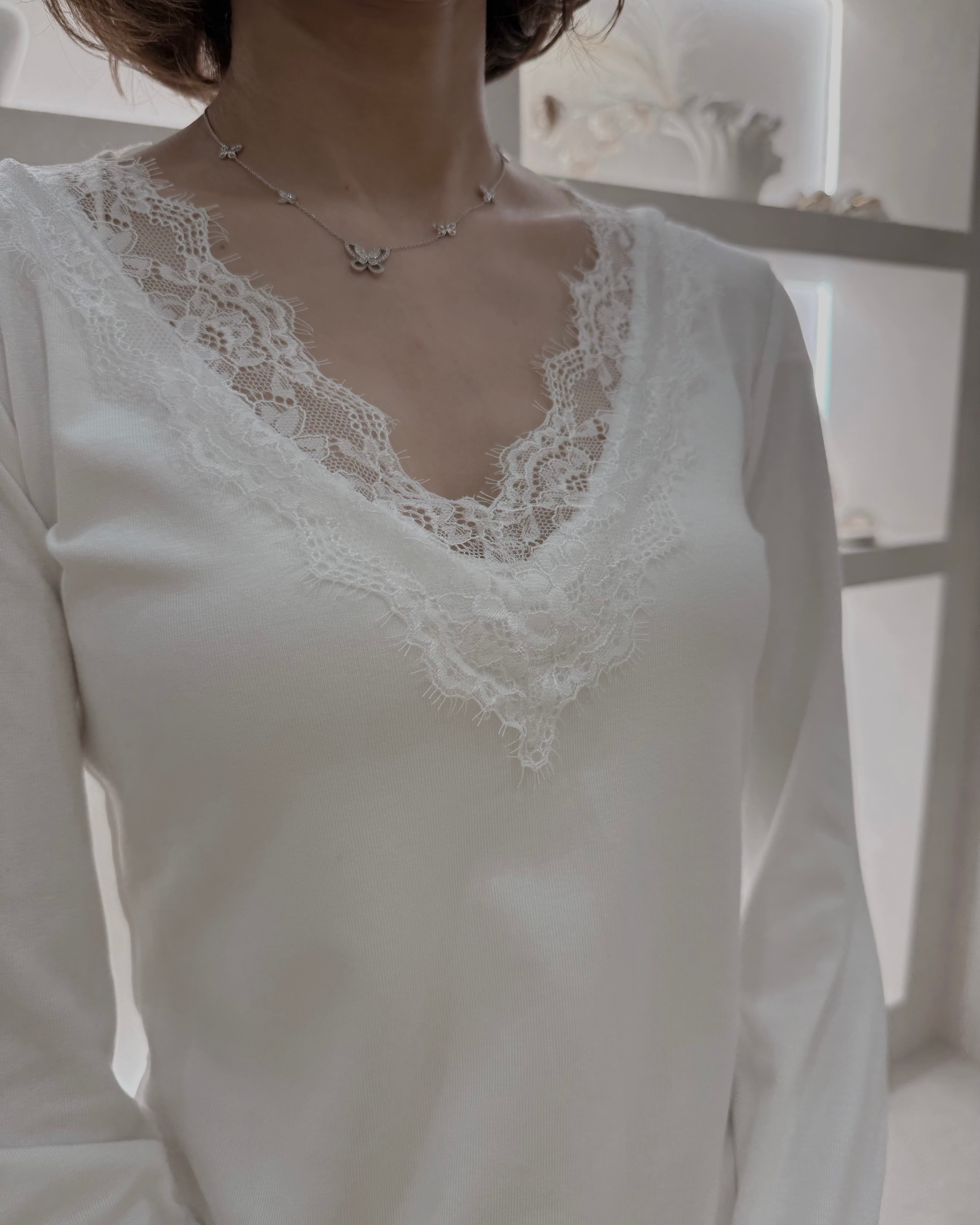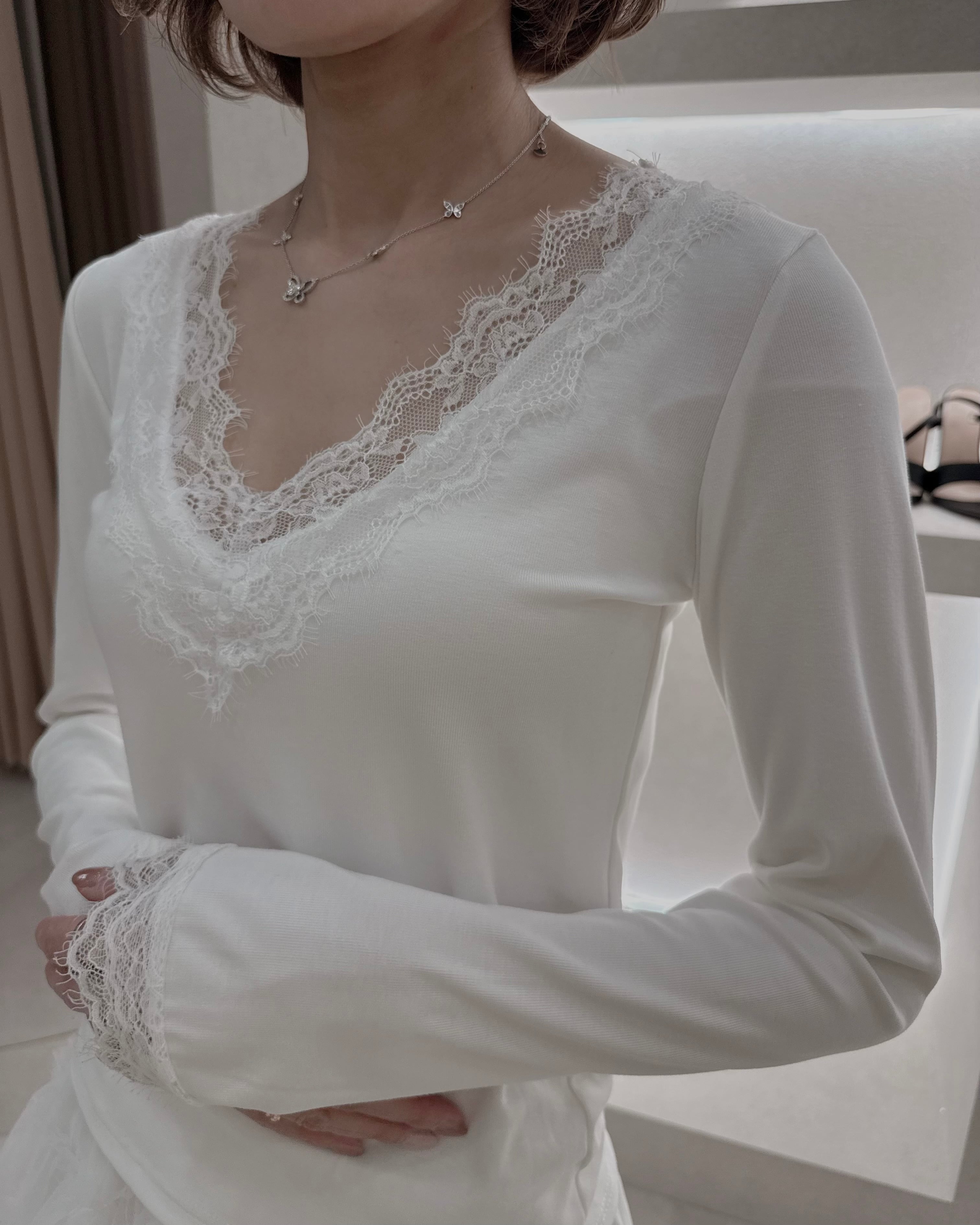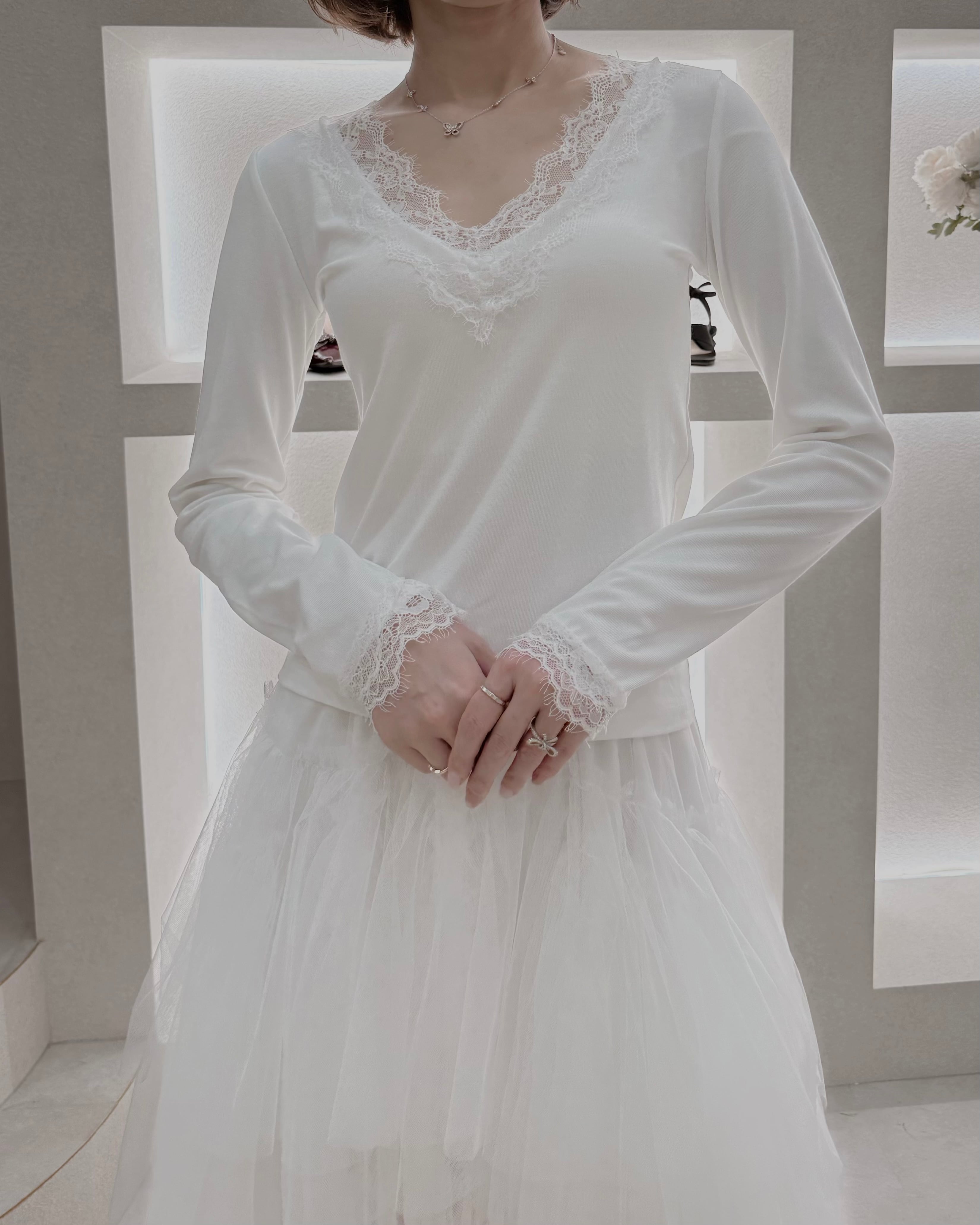 繊細なレースがさりげなく女性らしさを引き立てる一枚。