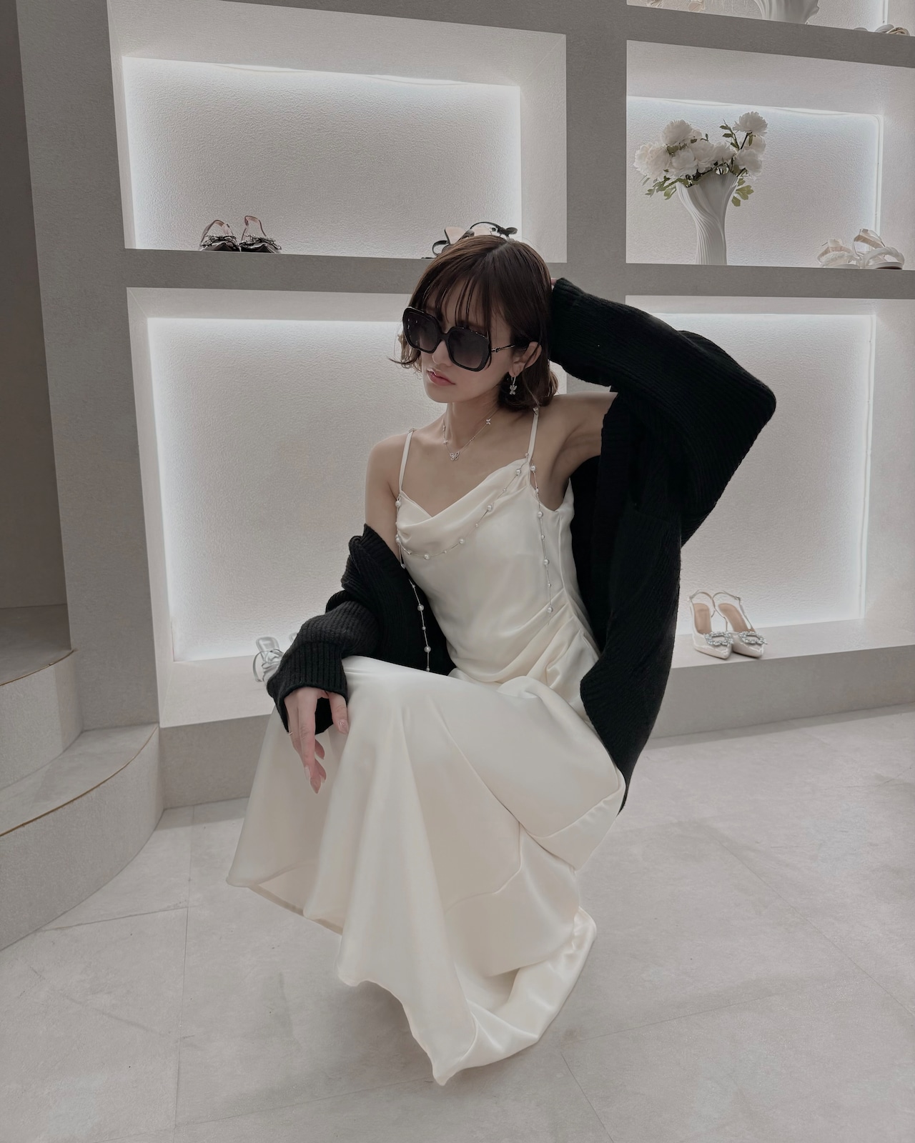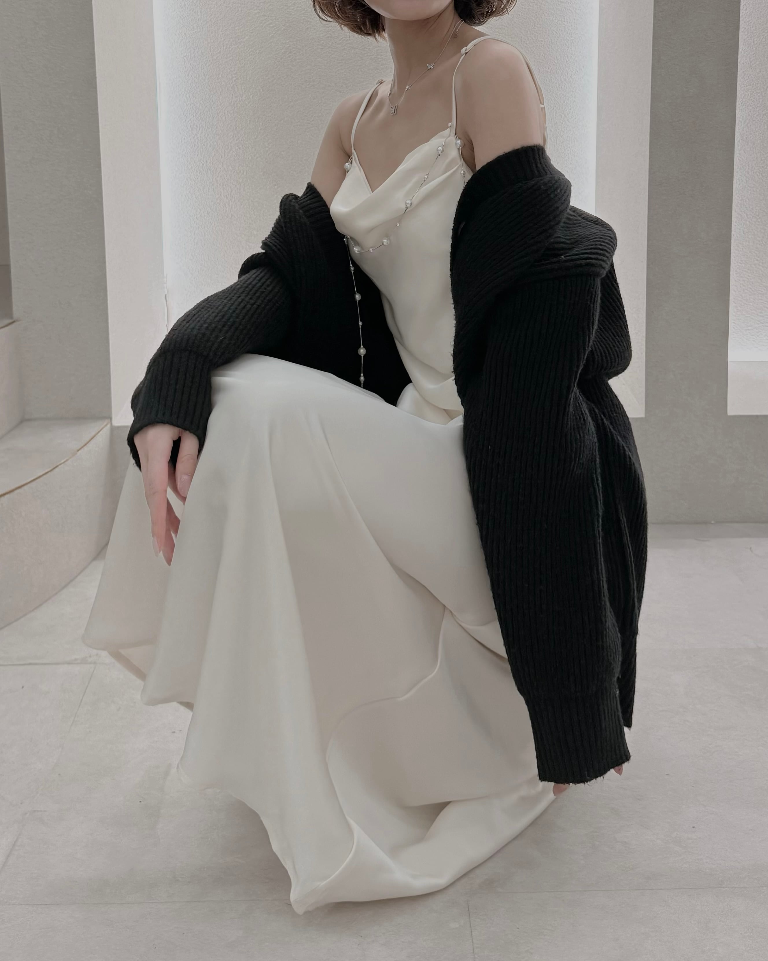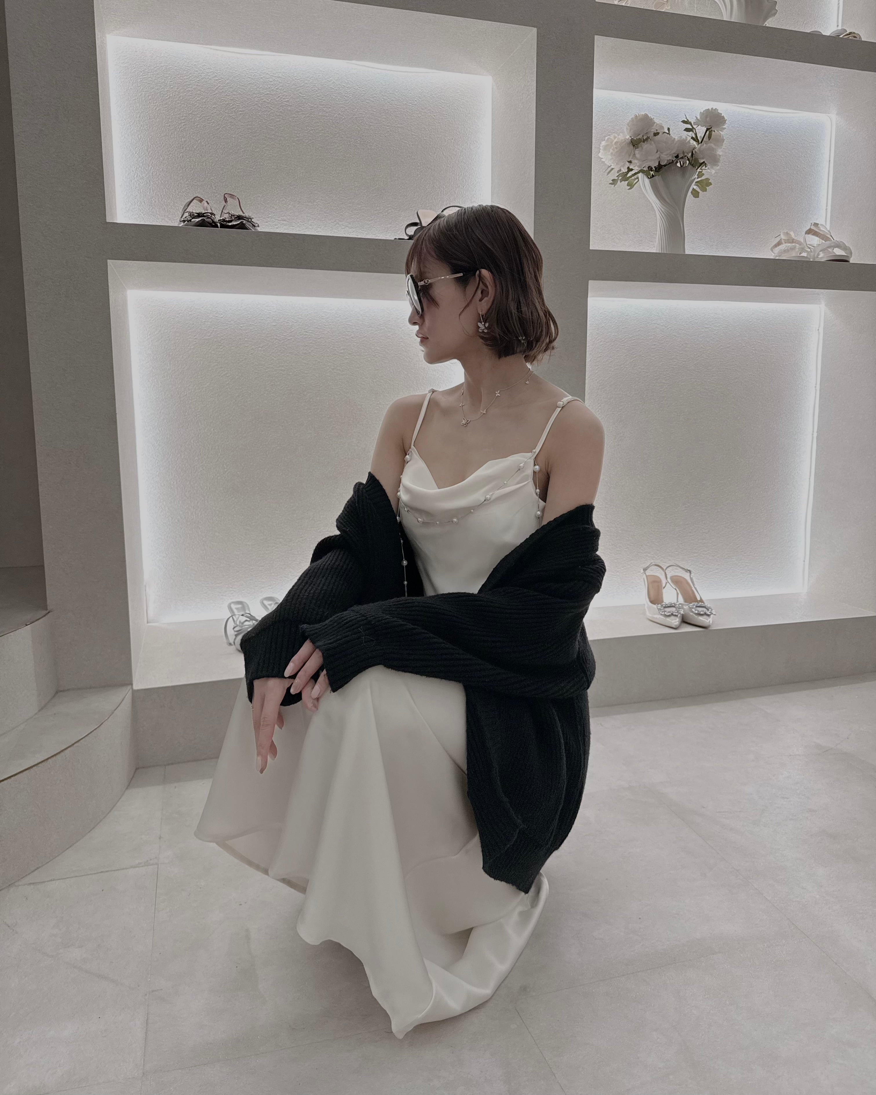 繊細なパールラインを添えた一着。
