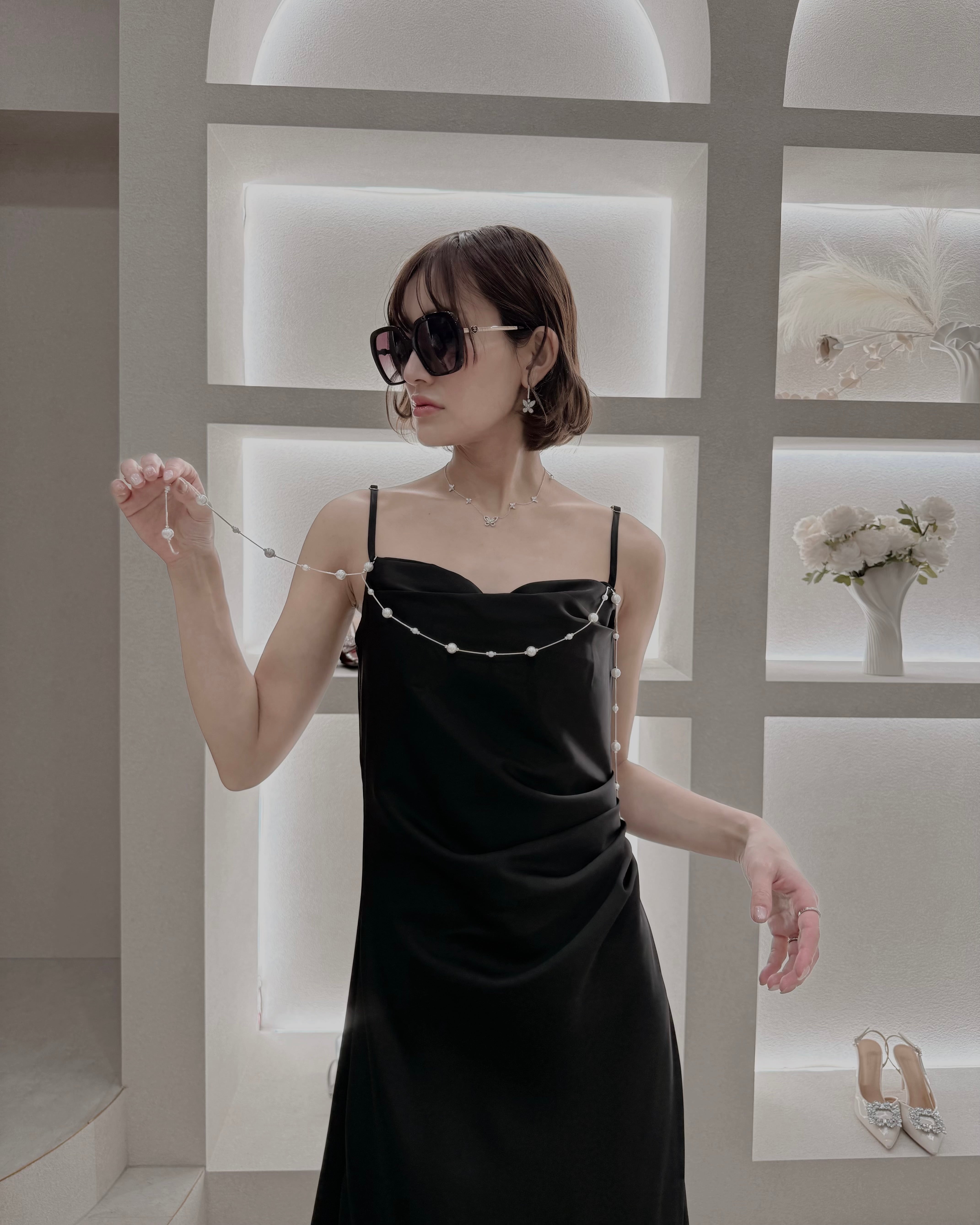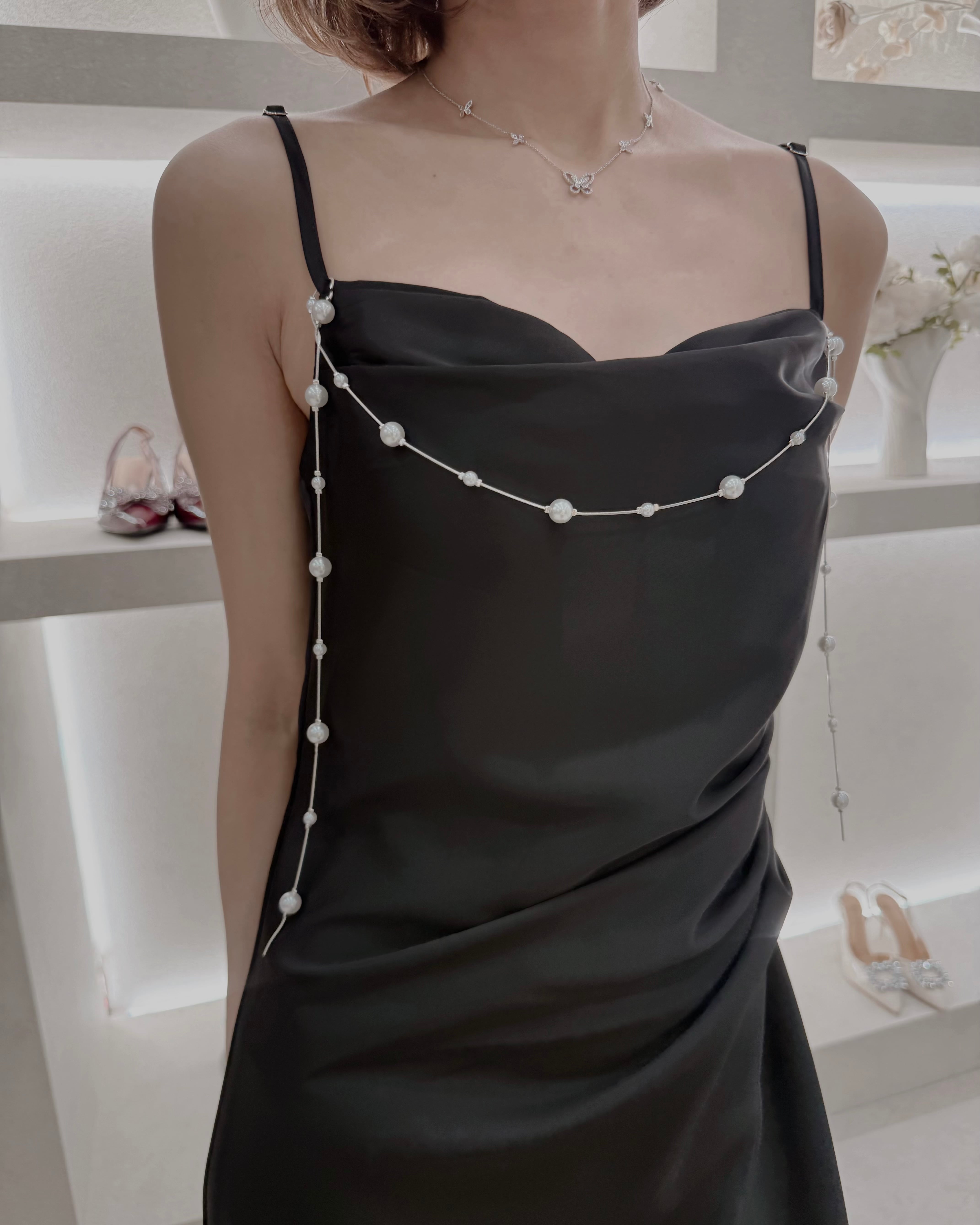 華奢なストラップとパールディテールが